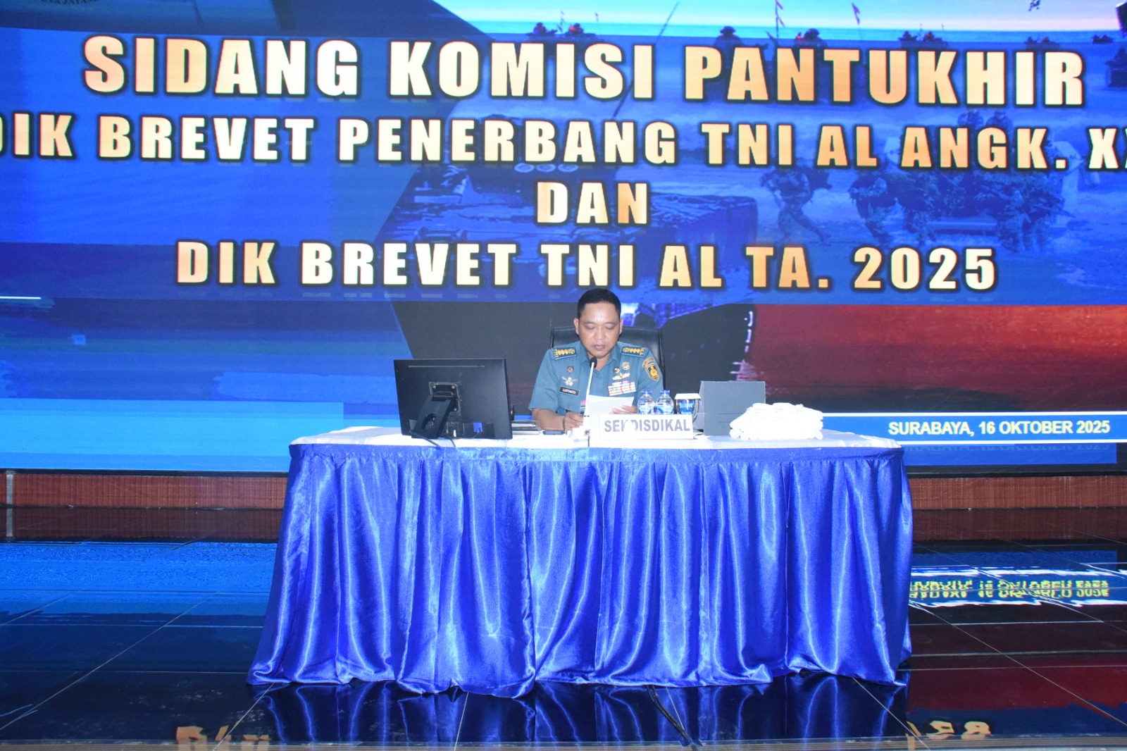 PI – Surabaya, 16 Oktober 2025 Sebanyak 174 Calon Siswa (Casis) TNI Angkatan Laut mengikuti Sidang Komisi Penentuan Akhir (Pantukhir) seleksi Pendidikan Perwira (Dikpa) Penerbang dan Pendidikan Brevet TNI AL TA. 2025. Sidang yang berlangsung di Gedung Mulyadi, Kodiklatal, Bumimoro Surabaya ini, dibuka secara resmi oleh Sekretaris Dinas Pendidikan Angkatan Laut (Sekdisdikal) Kolonel Laut (S) Lusyanto J., S.T., M.Sc. Kamis (16/10/2025).