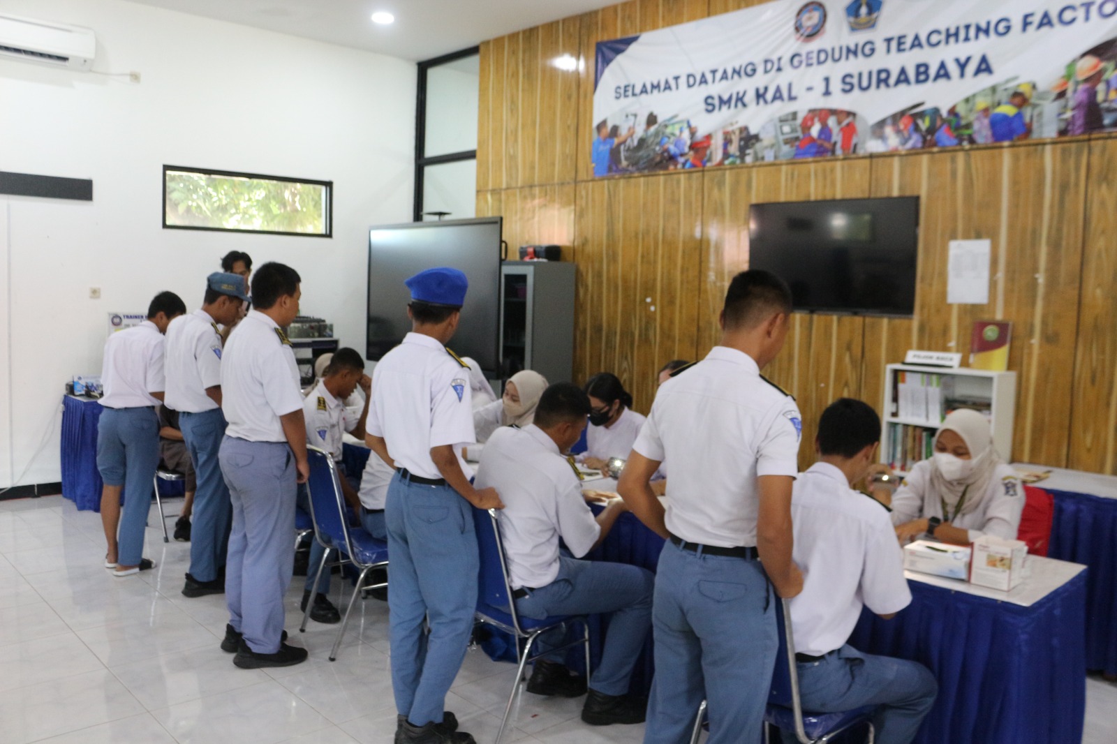 PI – Surabaya, (20/08/25) Sekolah Menengah Kejuruan Khusus Angkatan Laut SMK KAL-1 Surabaya Rabu,(20/08/25) melaksanakan pemeriksaan kesehatan khusus bagi 376 siswa kelas X dan XI semua jurusan (TPM,TKR, TITL, TAV dan T.LOG) , pemeriksaan kesehatan tersebut dilaksanakan oleh tim Medis dari Puskesmas Morokrembangan Surabaya yang berlangsung di Ruang TEFA (Teaching Factory) SMK KAL-1 tanpa di pungut biaya( gratis).