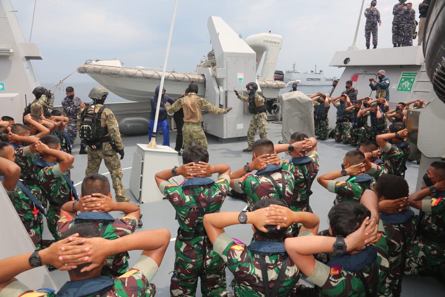 TNI AL. Koarmada II. Surabaya, 05 Januari 2021, Aksi demo pembebasan sandera yang dilakukan oleh Tim Visit, Board, Search and Seizure (VBSS) Satkopaska Koarmada II, sukses membuat terkesima 750 Taruna Akademi TNI yang mengikuti Bhinneka Eka Bakti (BEB) tahun 2022 di KRI Surabaya-591,Rabu (5/1).
