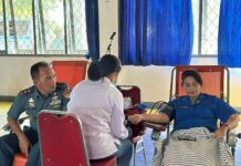 PI - Merauke, Komandan Kodaeral XI Laksamana Muda TNI Monang H. Sitompul, S.A.P., didampingi Ibu Ketua Daerah Kodaeral XI Gabungan Jalasenastri Koarmada RI, Ny. Yuli Monang, menghadiri Kegiatan Donor Darah..