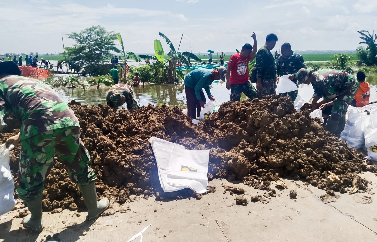 Bersama warga masyarakat setempat, personel TNI-Polri, BPBD, BBWS dan perangkat desa bergotong-royong berupaya membendung air yang mengalir deras menggunakan alat peralatan seadanya, seperti batang pohon bambu, sesek, terpal serta karung berisi tanah untuk penanganan darurat.