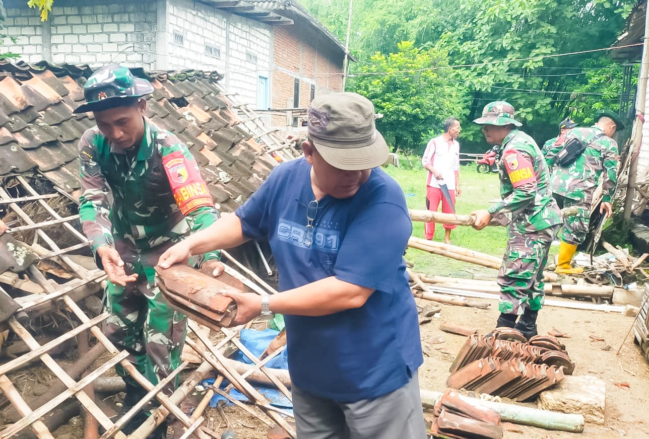 PI – BOJONEGORO, Dipimpin langsung oleh Bati Tuud Peltu Sujiono, sejumlah personel Babinsa jajaran Koramil 07/Kepohbaru Kodim 0813 Bojonegoro diturunkan untuk membantu membersihkan puing-puing rumah roboh milik bapak Amir (68) warga Dusun Kerjo RT.014 Desa Brangkal, Kecamatan Sugihwaras Kepohbaru Kabupaten Bojonegoro, Kamis (23/1/2025).