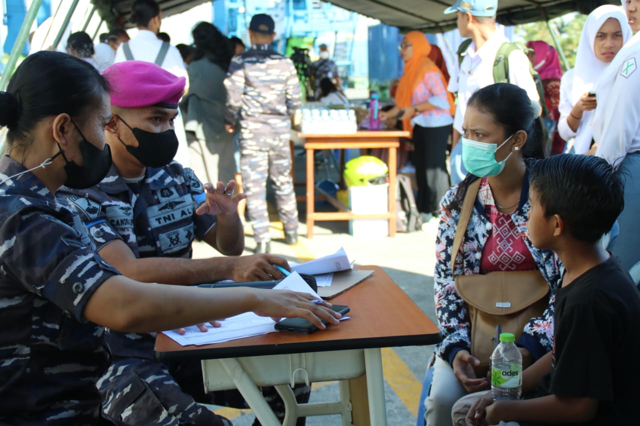 PI – Sorong, Dalam rangka memperingati HUT Ke-77 TNI AL tahun 2022, prajurit Petarung Batalyon Kesehatan 3 Marinir (Yonkes 3 Mar) turut mendukung suksesnya Hari Bakti Kesehatan yang diselenggarakan di KRI dr. Wahidin Sudiro Husodo (WSH-991) yang sandar di Dermaga Umum Pelabuhan Kota Sorong, Jl. Jendral A. Yani No.13, Kota Sorong, Papua Barat. Selasa (06/09/2022).