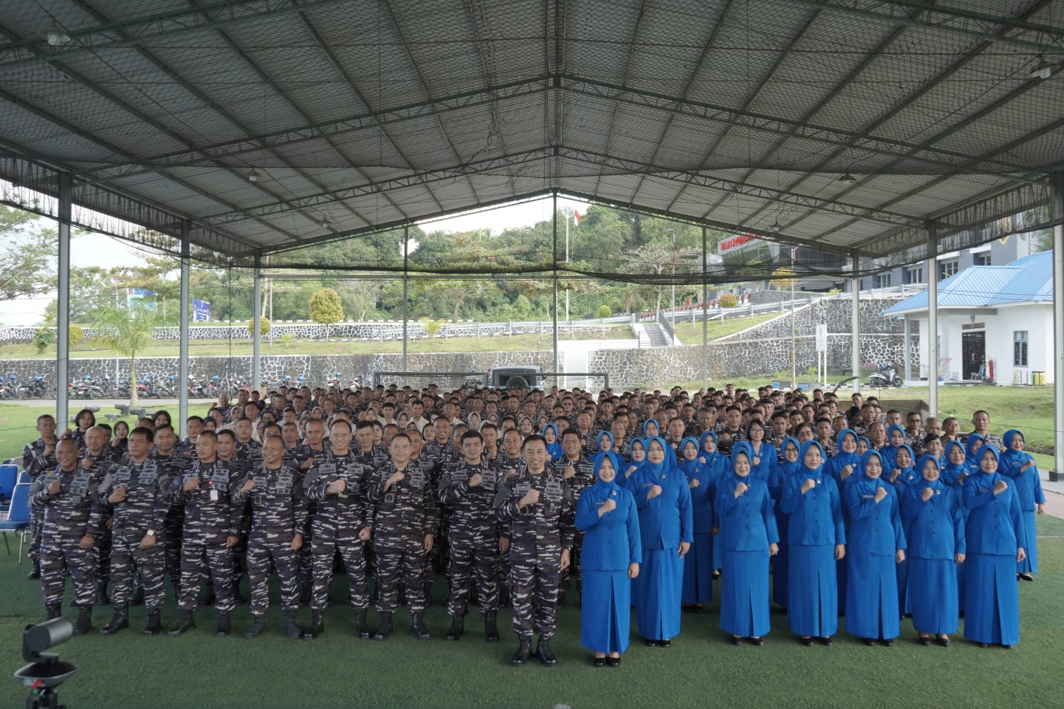 PI – Tarakan, 2 Maret 2026 Komandan Komando Daerah Angkatan Laut Laksamana Pertama TNI Sumarji Bimoaji, didampingi Ketua Daerah Kodaeral XIII GJK RI Ny. Alvita Bimoaji, menggelar _Entry Briefing_ bersama seluruh personel Kodaeral XIII, yang berlangsung di Lapangan Futsal Mako Kodaeral XIII, Kota Tarakan, Provinsi Kalimantan Utara, Senin (02/03).