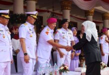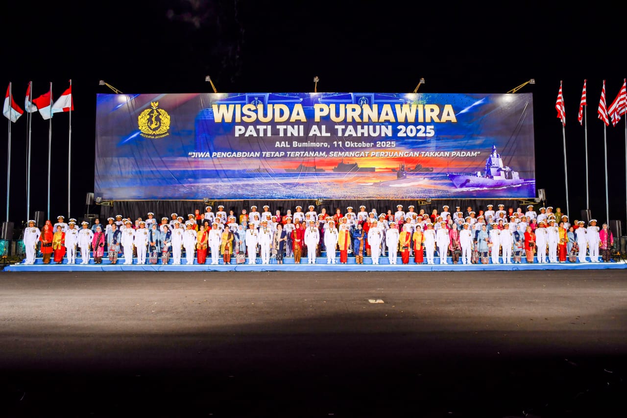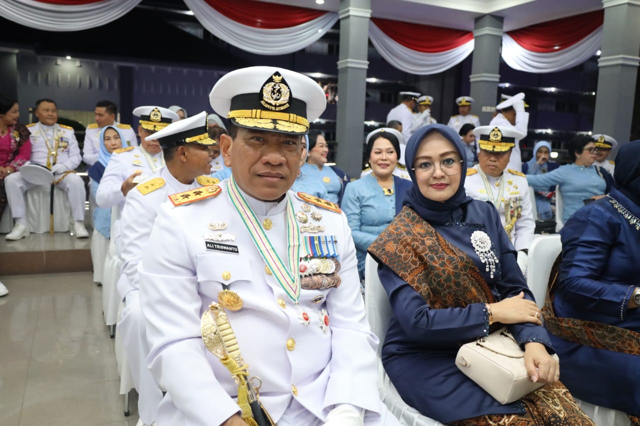 PI – Surabaya, Komandan Komando Daerah TNI AL (Dankodaeral) V Laksda TNI Ali Triswanto, S.E., M.Si., bersama Ketua Daerah Kodaeral V Gabungan Jalasenastri Koarmada RI Ny. Shandya Ali Triswanto menghadiri Upacara Wisuda Purna Wira (WPW) Perwira Tinggi (Pati) TNI AL Tahun 2025 yang digelar di Lapangan Laut Arafuru, Akademi Angkatan Laut (AAL), Bumi Moro, Surabaya. Sabtu Malam (11/10/2025)
