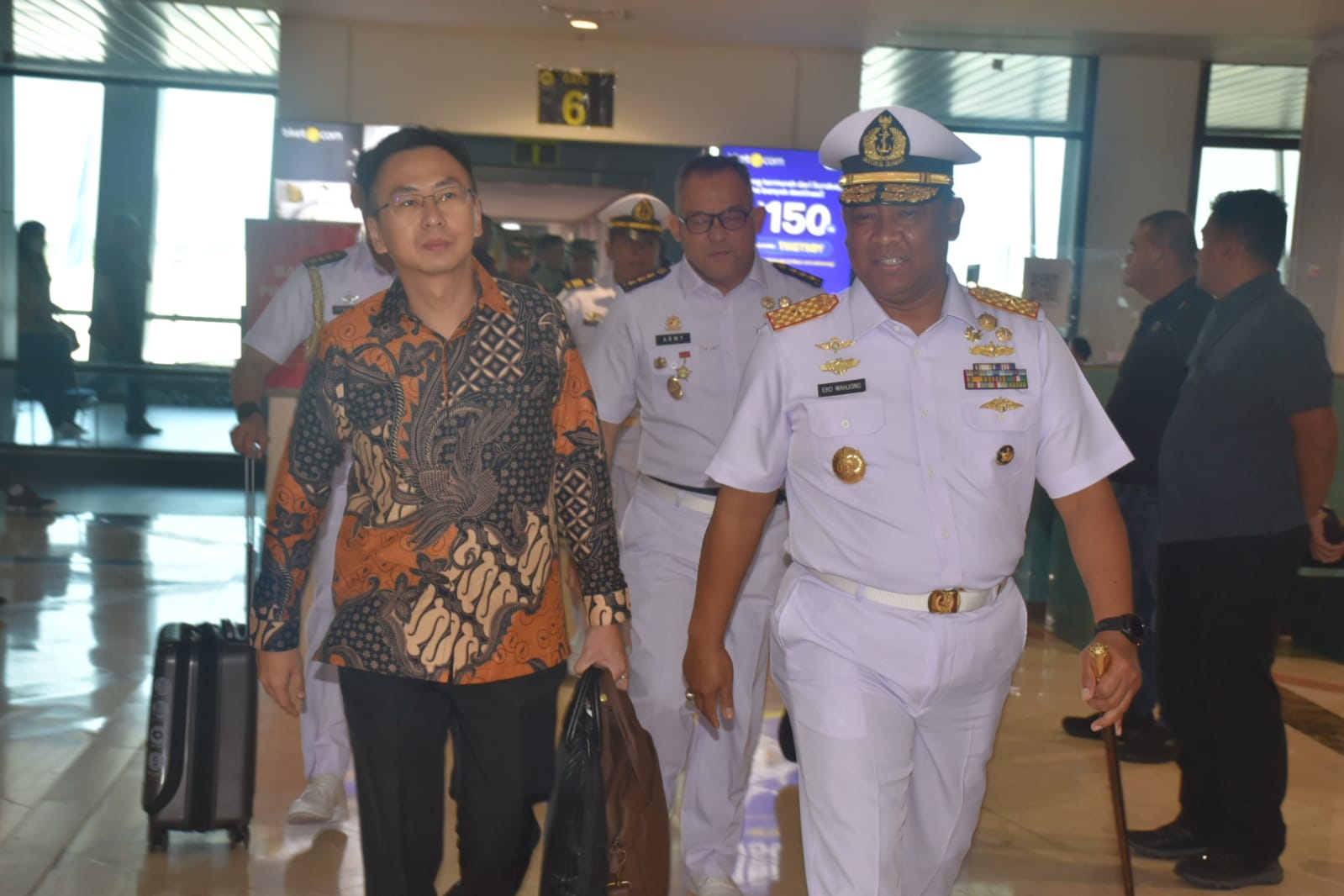 PI – Surabaya, 14 Juli 2023, Komandan Pangkalan Utama TNI AL (Danlantamal) V Laksamana Pertama TNI Eko Wahjono menyambut kedatangan Kasal Singapura RADM Sean Wat beserta rombongan, di Fly Navy Lounge T2 Bandara International Lanudal Juanda, Jumat (14/07/2023).