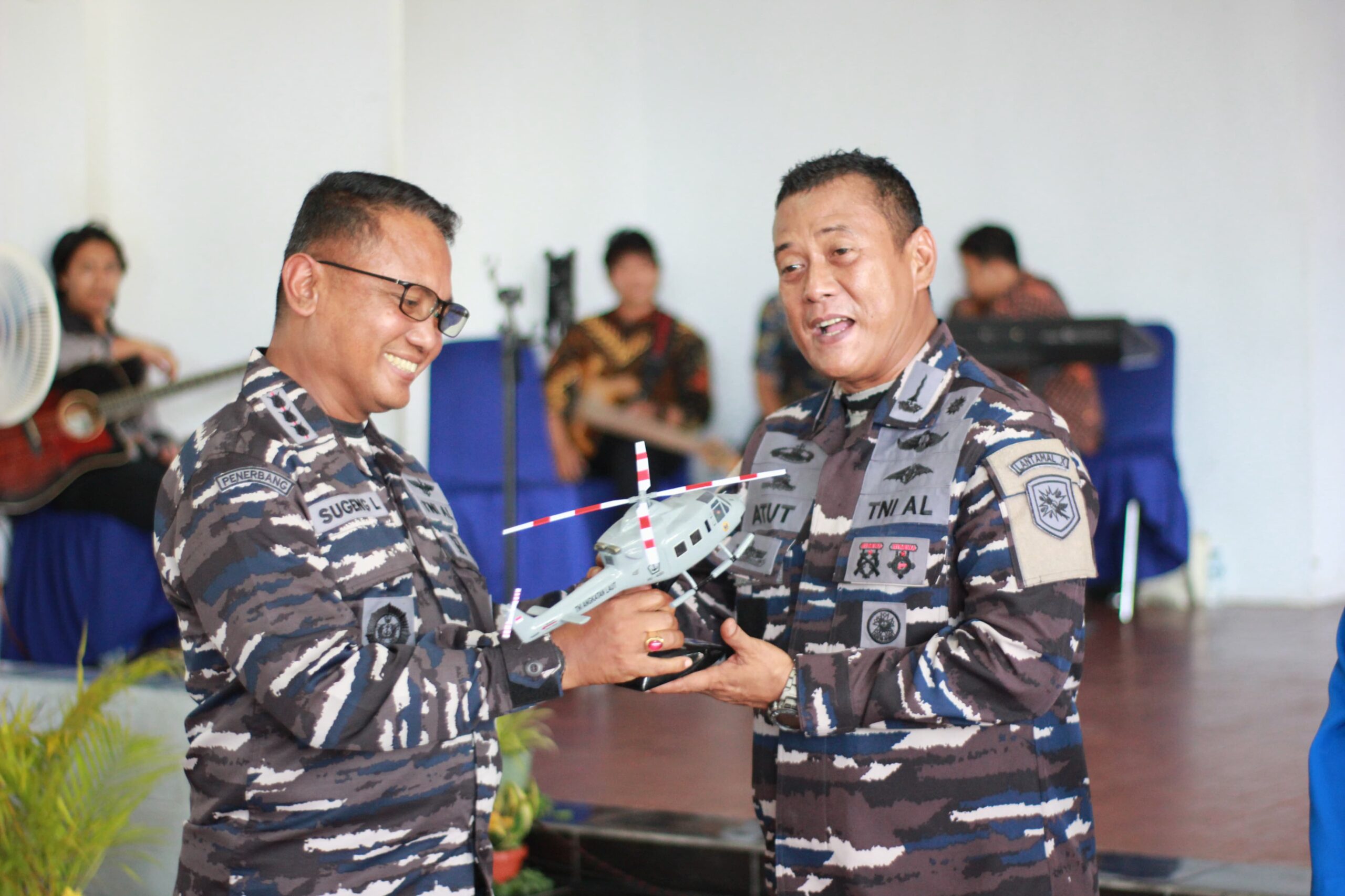 PI – Biak, Komandan Lanudal Kolonel Laut (P) Sugeng Lamiyo berikan Kolonel Mar Jinawi Atutwaluyanto miniatur NBell-412 pada acara Pisah Sambut Komandan Pangkalan TNI Angkatan Laut (Danlanal) Biak di gedung Hang Tuah Mako Lanal Biak, Senin (4/8/2025).