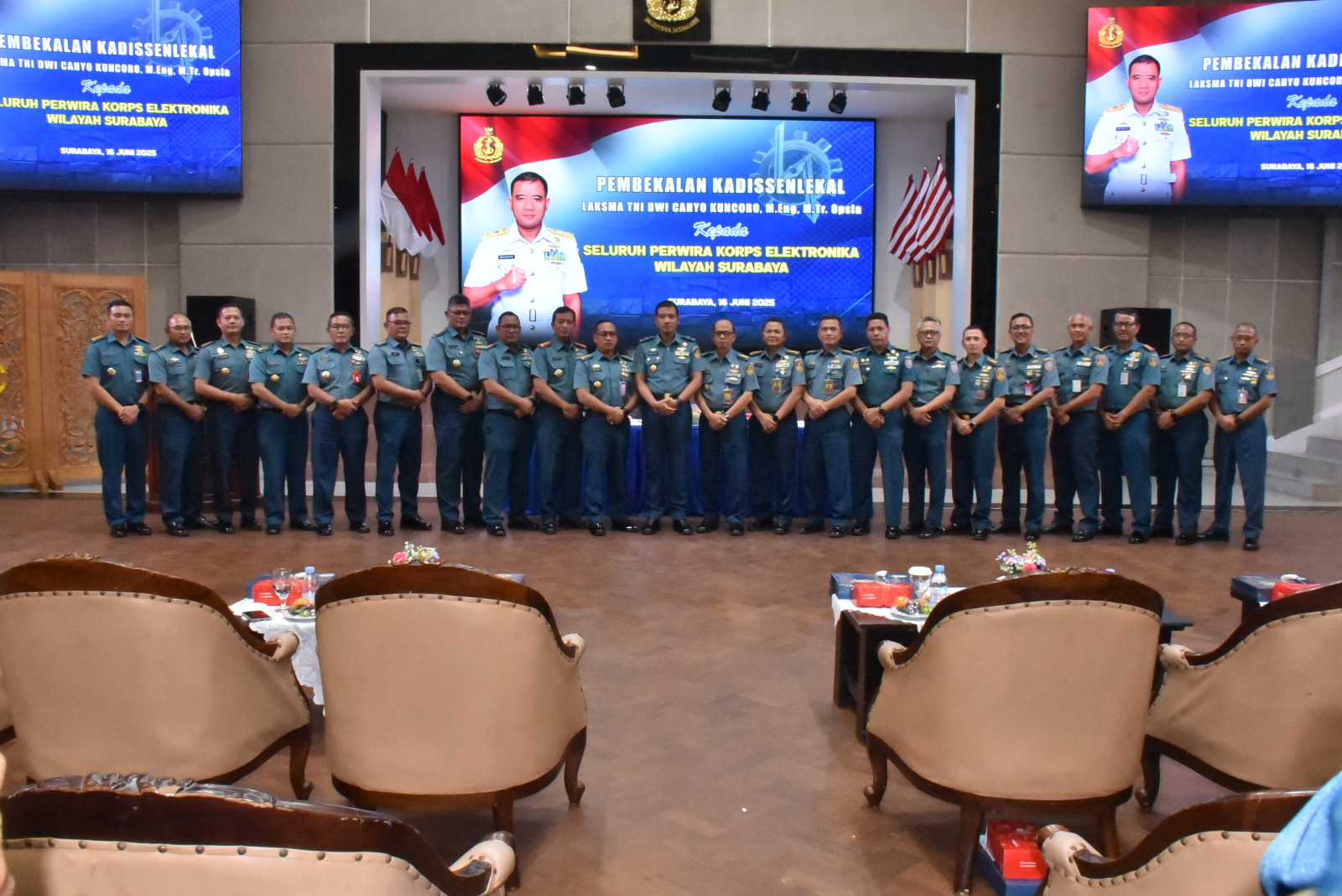 PI – Surabaya, 16 Juni 2025 Komandan Pusat Pendidikan Elektronika  Kodiklatal Kolonel Laut (E) Yusuf Budi Santosa, beserta Perwira Menengah (Pamen) Korps Elektronika dari Kodiklatal mengikuti Pembekalan Kadissenlekal Laksamana Pertama TNI Dwi Cahyo Kuncoro, yang berlangsung di Gedung PTA Koarmada II Ujung, Surabaya. Senin (16/06/2025).