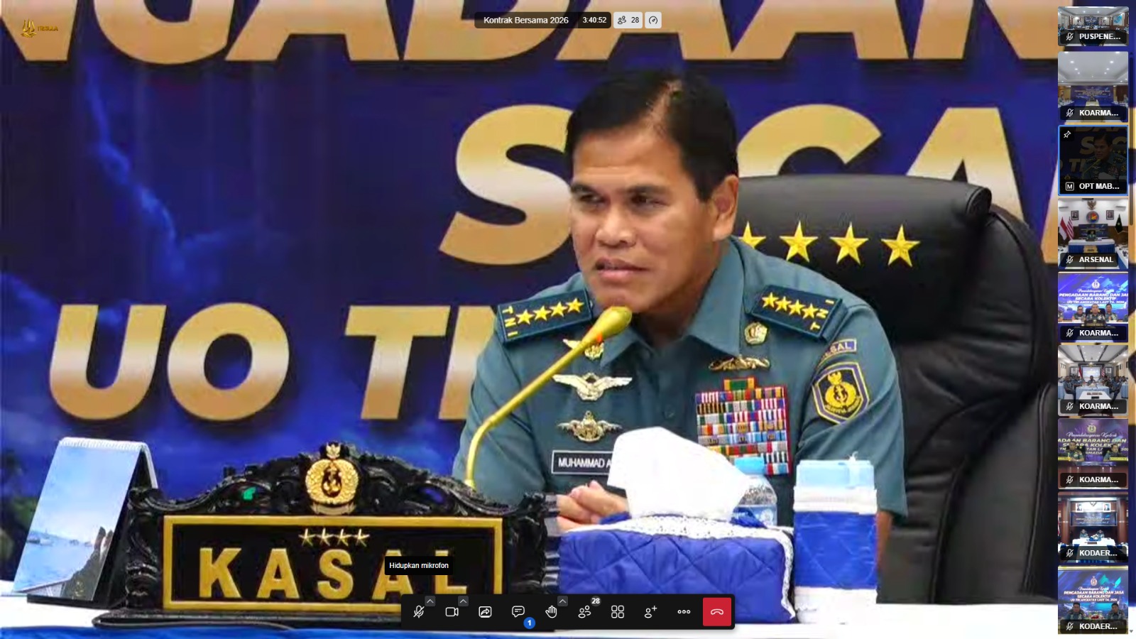 Dalam sambutan Kasal pada video cenference menyampaikan bahwa TNI Angkatan Laut resmi memulai tahun anggaran 2026 dengan menandatangani 113 kontrak pengadaan secara serentak, melibatkan 40 Satuan Kerja (Satker) di seluruh Indonesia, langkah ini bertujuan mempercepat daya serap anggaran dan memastikan pembangunan kekuatan laut tepat waktu.