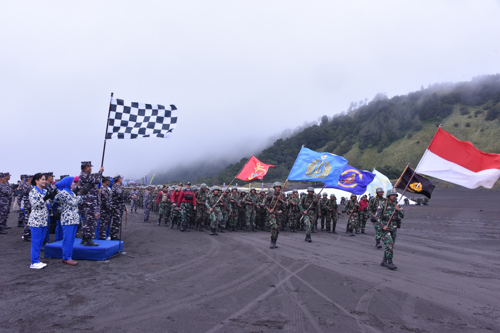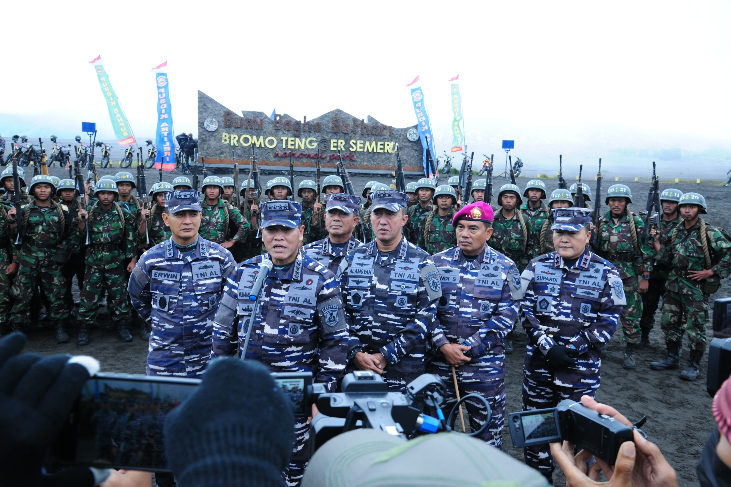 PI – Probolinggo, 14 Maret 2024, Komandan Kodiklatal (Dankodiklatal) Letjen TNI Marinir Nur Alamsyah mendampingi Kepala Staf Angkatan Laut (Kasal) Laksamana TNI Dr. Muhammad Ali beserta Petinggi TNI AL lainnya melepas Siswa Pendidikan Pendidikan Komando (Dikko) Marinir Angkatan 173 Kodikmar Kodiklatal yang melaksanakan Lintas Medan (Limed) dari Lautan Pasir, Gunung Bromo Probolinggo, Jawa Timur. Kamis (14/03/2024).