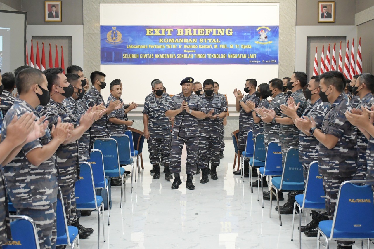 PI – STTAL Surabaya, Menjelang acara serah terima jabatan (Sertijab) yang direncanakan pada hari senin tanggal 13 juni 2022 bertempat di lapangan upacara Pondok Dayung Jakarta mendatang, Komandan Sekolah Tinggi Teknologi Angkatan Laut (STTAL) Laksamana Pertama TNI Dr. Ir. Avando Bastari, M. Phil., M.Tr. Opsla berpamitan kepada seluruh civitas akademika STTAL yang dihadirii Wadan STTAL Kolonel Laut (P) Yoyok Nurkarya Santosa, S.T., M.T CHRMP., CACA., Pejabat Utama, Kasatker, Perwira, Bintara,Tamtama, PNS STTAL dan para mahasiswa STTAL yang dikemas dalam acara exit briefing di Auditorium Gd. Marore Kampus STTAL Bumimoro Surabaya. Jumat (0/6/2022)