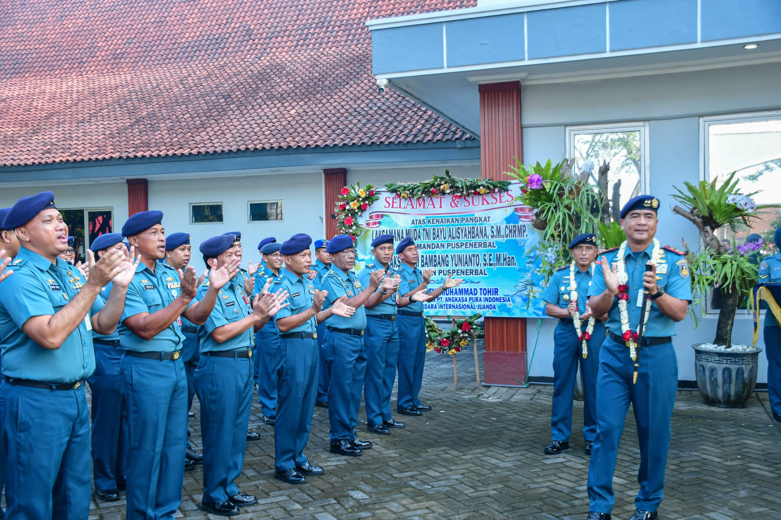PI – Sidoarjo, Puspenerbal (2/6/2025). Prajurit Penerbangan TNl AL tampak gegap gempita menyambut Komandan Puspenerbal, Laksda TNl Bayu Alisyahbana dan Wakil Komandan Puspenerbal, Laksma TNI Bambang Yuninto untuk kali pertama masuk kantor pasca kenaikan pangkat pekan lalu di Markas Komando Puspenerbal, Juanda pada Senin (2/6/2025).