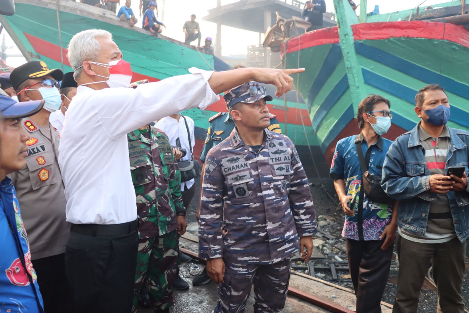 PI – Tegal, 17 Agustus 2023, Gubernur Jawa Tengah H. Ganjar Pranowo,. S.H.,M.I.P menunjuk Komandan Pangkalan TNI AL (Danlanal) Tegal Letkol Mar Moch. Chanan Asfihani, M.Tr.Hanla. Sebagai Dansatgas penanggulangan kebakaran kapal di Kawasan Pelabuhan Perikanan Pantai (PPP) Tegalsari Kota Tegal. (16/08/2023).