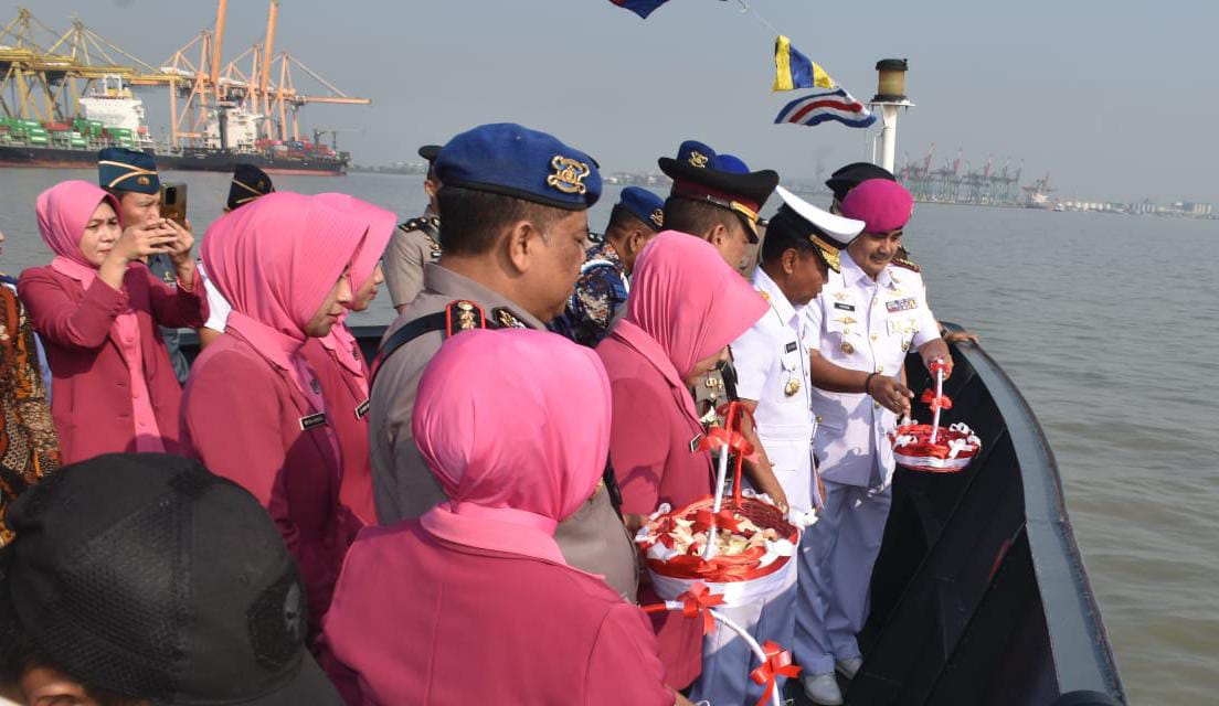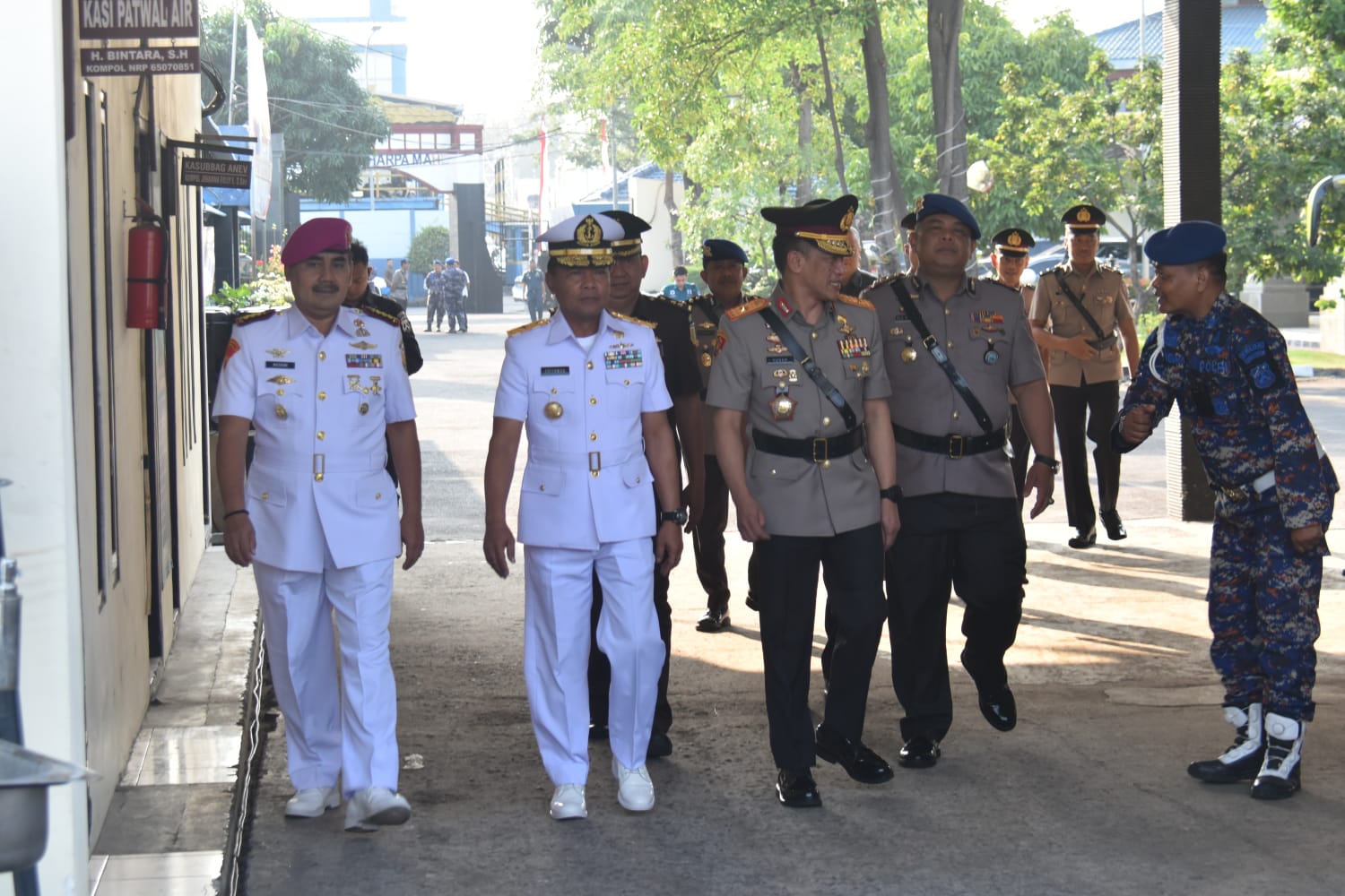 PI – Surabaya, Dalam rangkaian menyambut hari Bhayangkara Ke-77 tahun 2023, Komandan Pangkalan Utama TNI AL (Danlantamal) V Laksamana Pertama TNI Eko Wahjono diwakili oleh Wadan Lantamal V Kolonel Marinir Baedhowi Oktafidia mengikuti tabur bunga dengan mengusung tema “Polri Presisi Untuk Negeri Pemilu Damai Menuju Indonesia Maju” di Dermaga Mako Ditpolairud Polda Jatim Jalan Intan No.1 Tanjung Perak, Surabaya. Selasa (27/06/2023).
