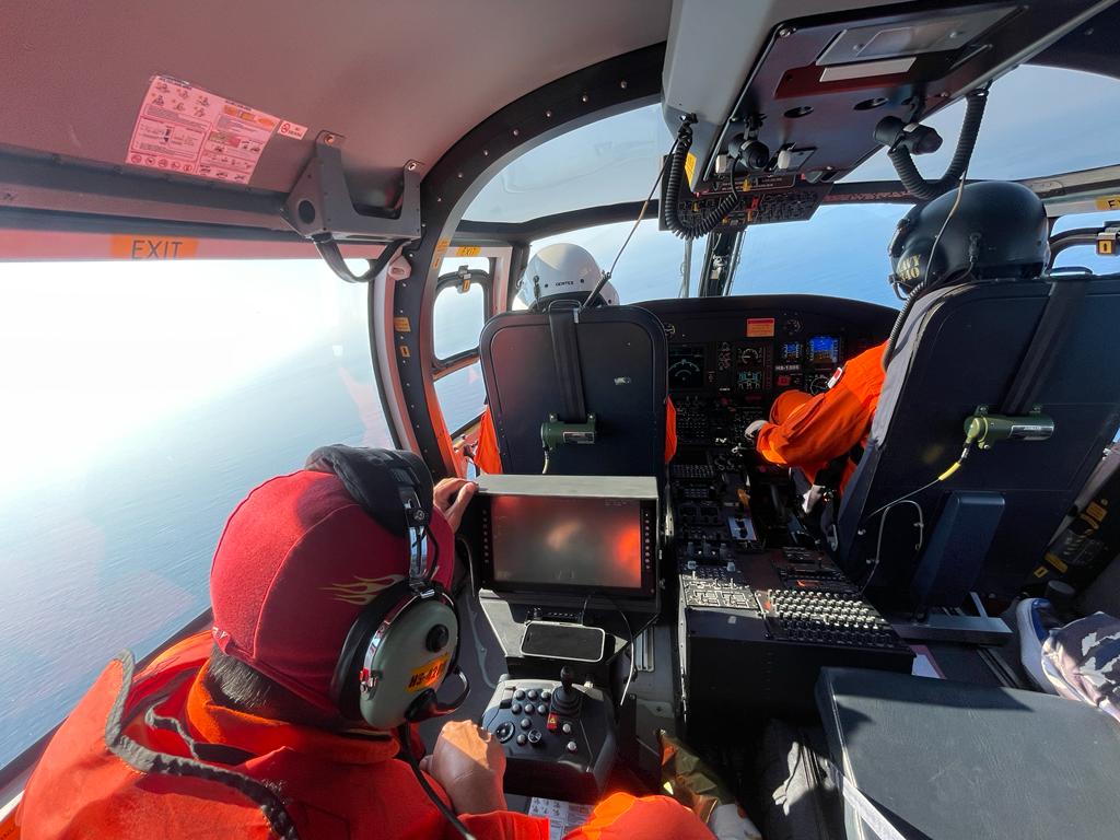 Selanjutnya untuk mempercepat proses pencarian, Heli HS-1305 dengan Captain Pilot Kapten Laut (P) Rayendra Jaka dan Copilot Lettu Laut (P/W) Michelle mendapatkan perintah terbang untuk melaksanakan pencarian di area sekitar posisi duga kapal tenggelam sekitar jarak 10 NM dari KRI dengan menggunakan sensor Forward Looking Infra Red (FLIR).