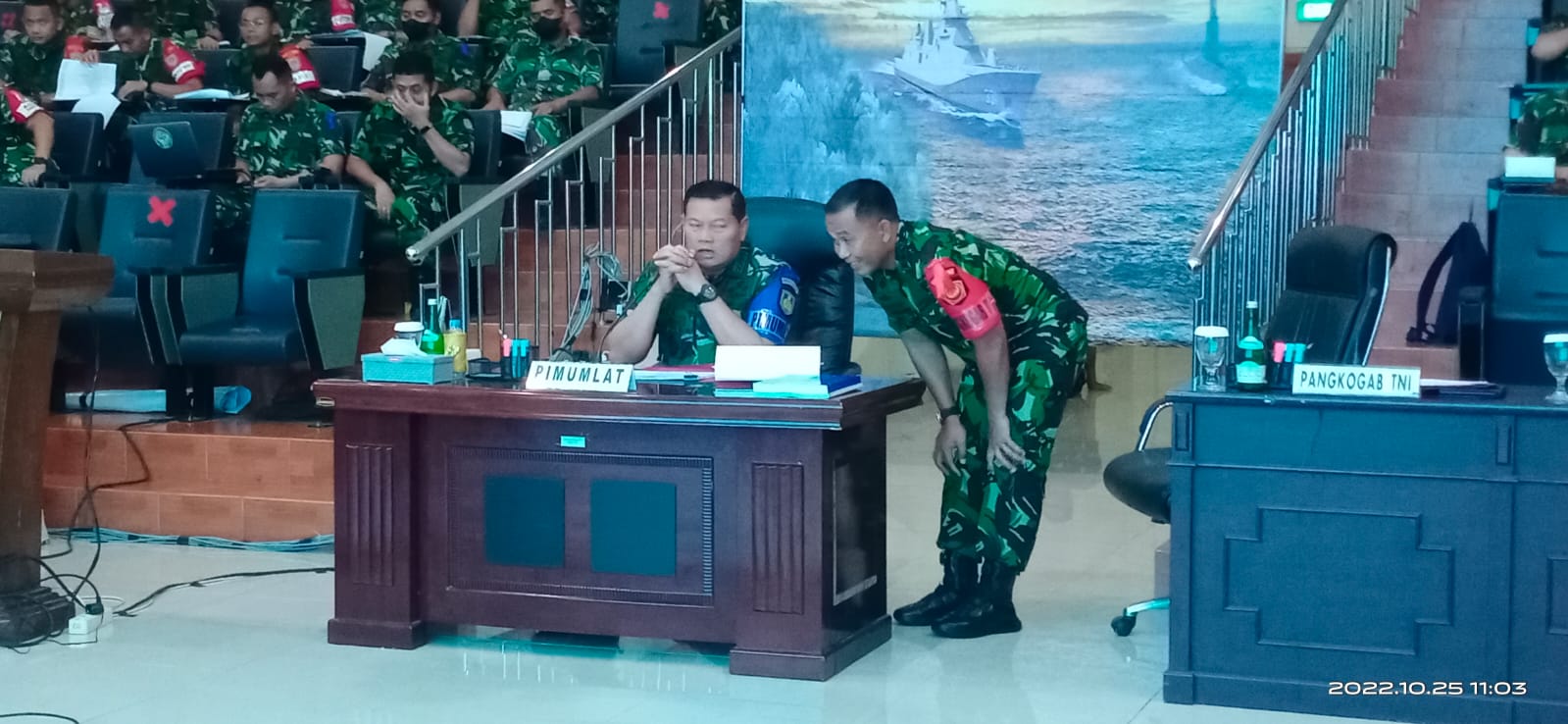 PI – Surabaya, 25 Oktober 2022,.–Kepala Staf Angkatan Laut (Kasal) Laksamana TNI Yudo Margono selaku Pimpinan Umum (Pimum) Latihan Armada Jaya XL TA.2022 meninjau dan sekaligus memimpin langsung pelaksanaan uji Konsep Rencana Operasi (RO) dengan metode Tactical Floor Game (TFG) secara Virtual dari Ruang Olah Yudha Mako Kogab TNI di Auditorium Joint Operational Planning Role (JOPR), Gedung R.Sudomo, Kodiklatal, Bumimoro, Surabaya, Selasa, (25/10/2022).