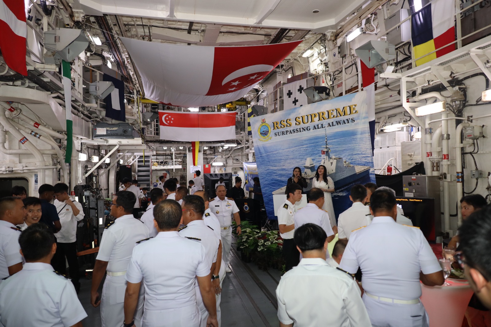 PI – Surabaya, 02 Juli 2025 Komandan Pusdik Intelmar Kodiklatal Kolonel Laut (S) Yudodi Ananta Wiguna beserta Komandan Pusdiklapa Kodiklatal Letkol Laut (P) Mochamad Reza A., menghadiri acara The Deck Reception yang diselenggarakan oleh pihak RSN di atas kapal perang RSS Supreme-73 yang tengah sandar di Dermaga Jamrud Utara Pelabuhan Tanjung Perak Surabaya, pada Senin malam (01/07/2025).