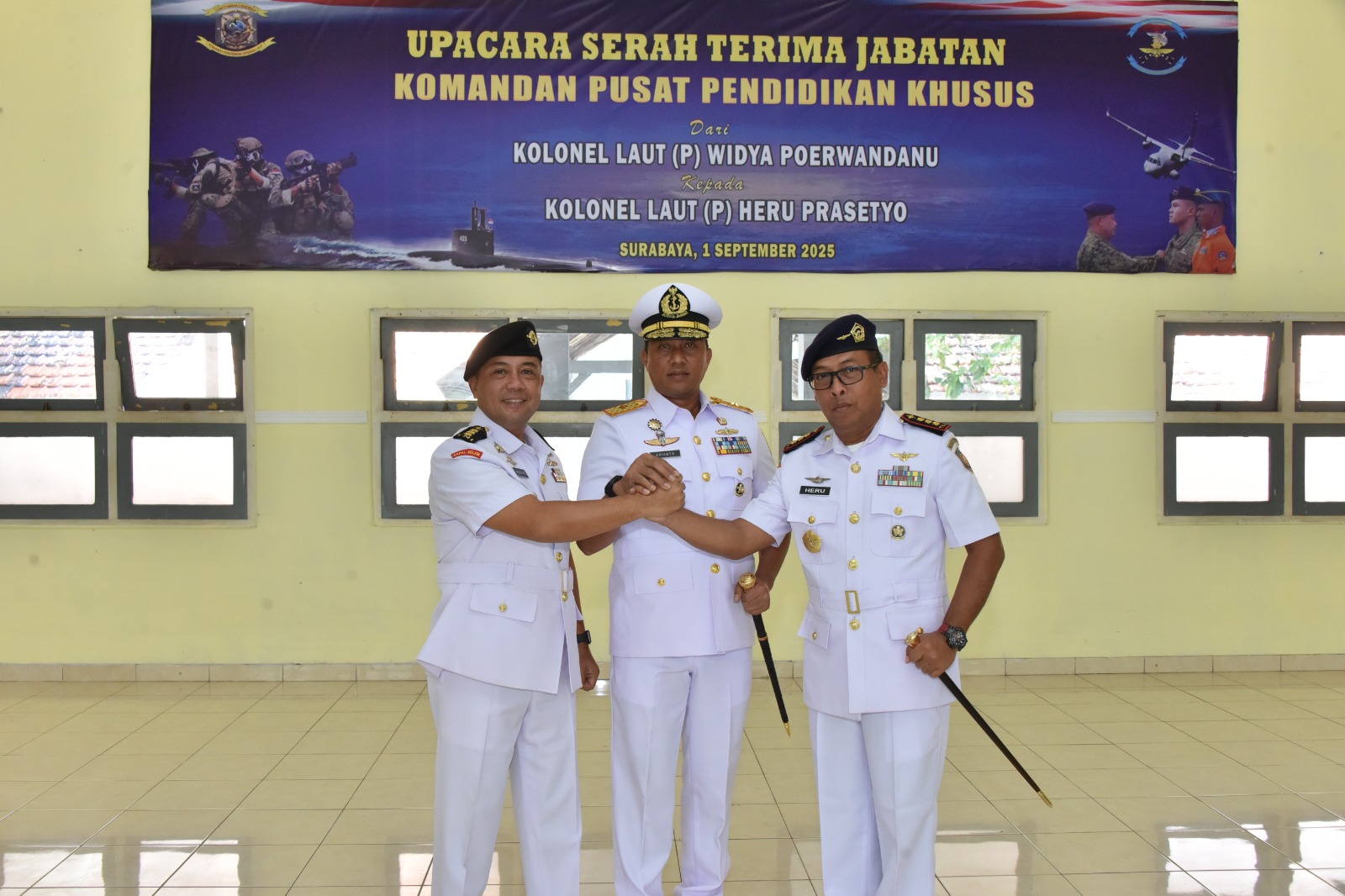 PI – Surabaya, 1 September 2025 Komandan Kodikopsla Laksma TNI Avianto Rooswirawan memimpin Serah Terima Jabatan (Sertijab) dan penyerahan tongkat komando Komandan Pusdiksus (Danpusdiksus) Kodikopsla Kodiklatal dari Kolonel Laut (P) Widya Poerwandanu kepada Kolonel Laut (P) Heru Prasetyo, bertempat di Gedung Antares Sekom Kodikopsla Kodiklatal, Ujung Surabaya. Senin (1/9/2025).