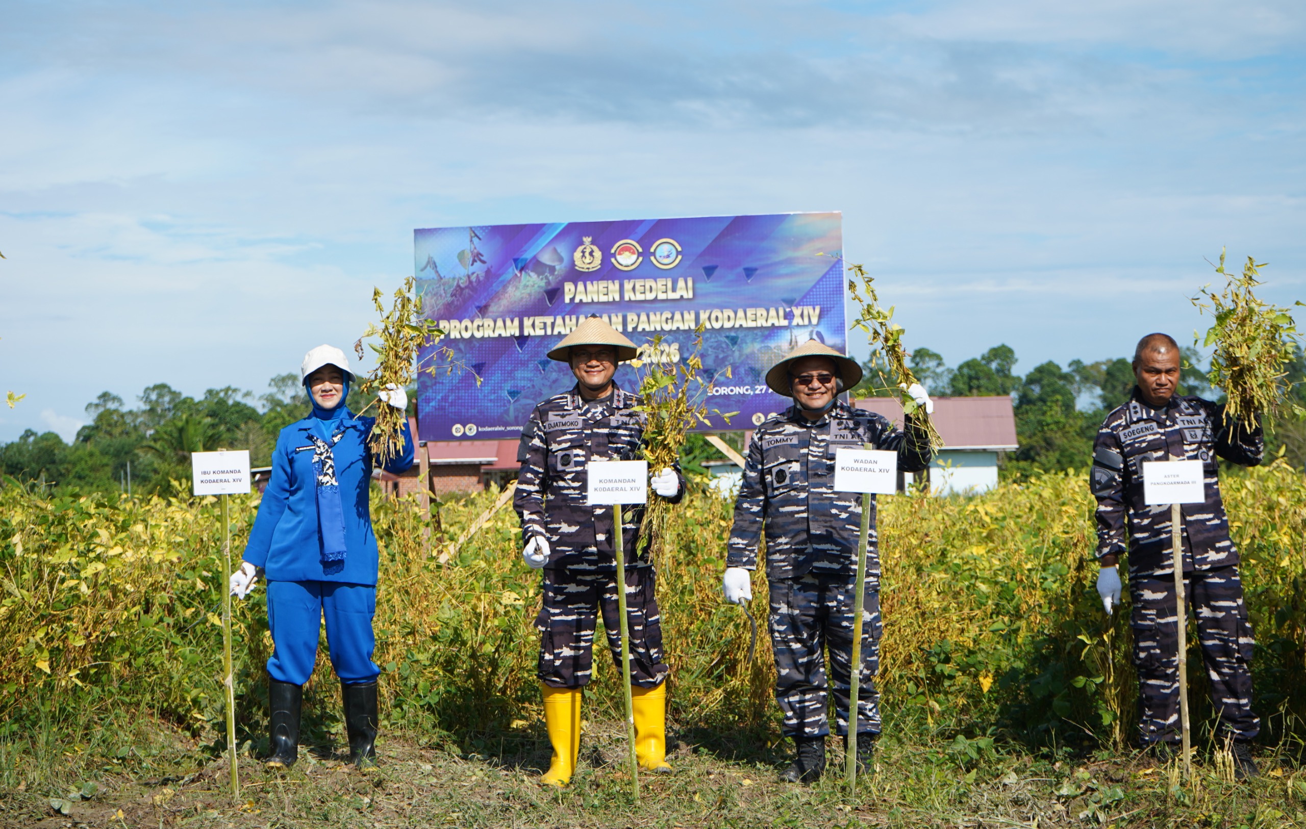 PI – Sorong , Komandan Komando Daerah TNI Angkatan Laut XIV (Komandan Kodaeral XIV) Sorong, Laksamana Muda TNI Djatmoko, S.T., M.M., CHRMP., mengajak pihak swasta, Pemerintah Daerah, dan seluruh pemangku kepentingan untuk terus memperkuat kolaborasi dalam mendukung program ketahanan pangan agar semakin luas dan berkelanjutan, hal terebut disampaikannya saat pelaksanaan Panen Kedelai Program Ketahanan Pangan Kodaeral XIV Tahun 2026 yang dilaksanakan di Kampung Mariyai, Distrik Mariat Aimas Kabupaten Sorong Papua Barat Daya. Senin (27/04/2026).