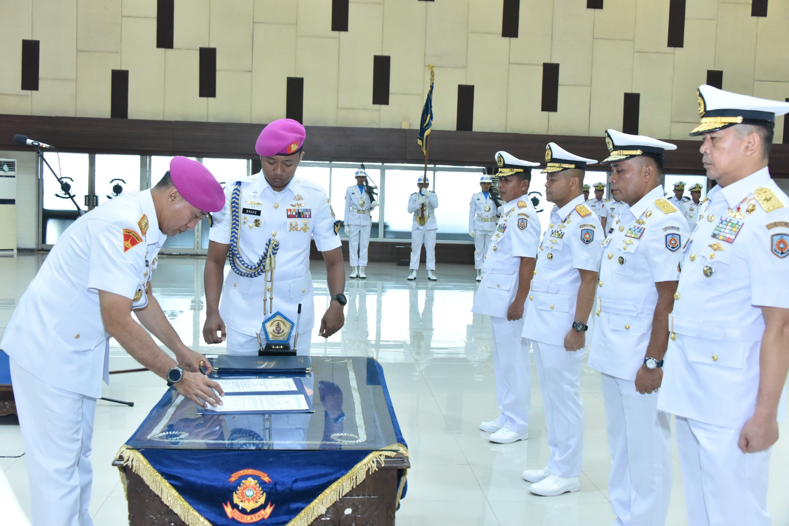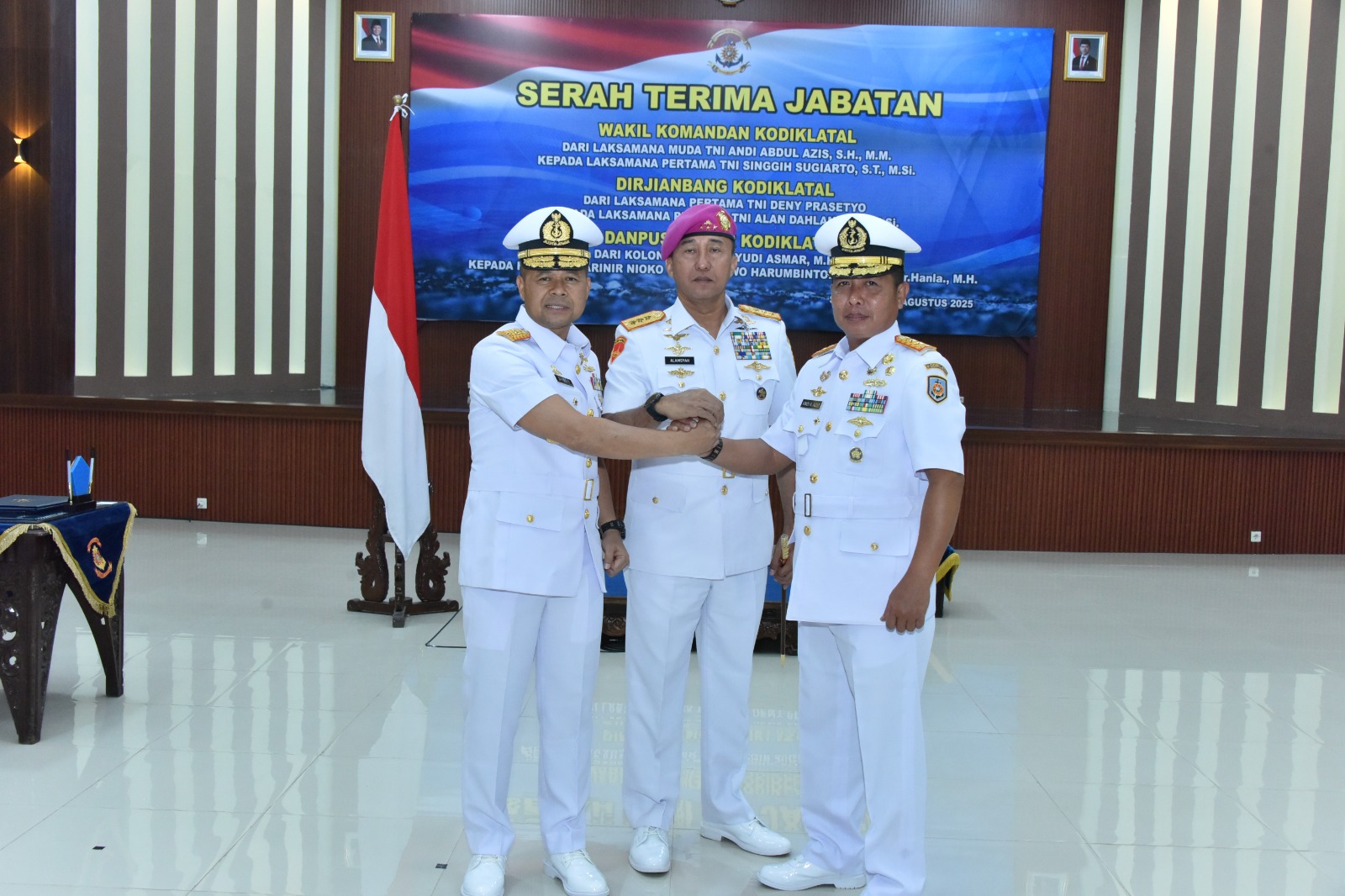 PI – Surabaya, 25 Agustus 2025 Komandan Komando Pembinaan Doktrin, Pendidikan dan Latihan TNI Angkatan Laut Letjen TNI Marinir Nur Alamsyah, memimpin upacara Pengambilan Sumpah dan Serah Terima Jabatan (Sertijab) tiga jabatan strategis di lingkungan Kodiklatal, yang digelar di Gedung R.E. Martadinata, Senin (25/8/2025).