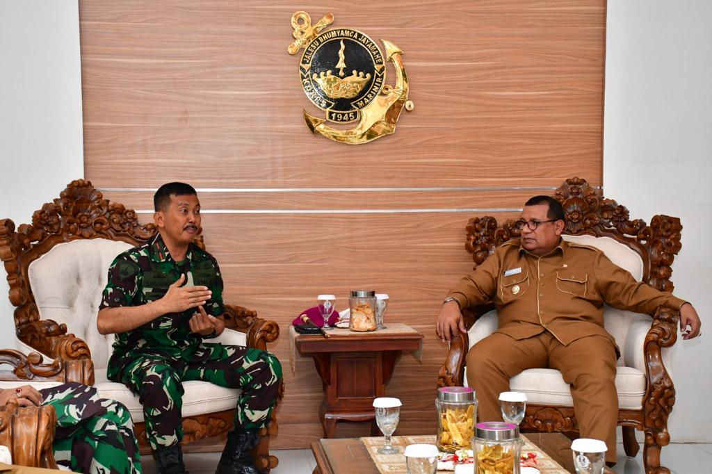 PI – Sorong, Selasa (04/04/2023). Komandan Pasmar 3 Brigjen TNI (Mar) Sugianto, S.Sos, menerima kunjungan kerja Pj. Gubernur Papua Barat Daya Dr. Drs. Muhammad Musa’ad, M. Si., beserta para Pj Bupati se-Papua Barat Daya di Ruang VIP Mako Pasmar 3, Jl. Sorong-Klamono, Km. 16, Distrik Klaurung, Kota Sorong, Papua Barat Daya.