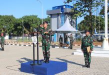 PI – Surabaya, 24 Juli 2023, Komandan Pusat Latihan dan Pendidikan Dasar Kemiliteran ( Danpuslatdiksarmil) Komando Pembinaan Doktrin, Pendidikan dan Latihan TNI AL (Kodiklatal) Kolonel Laut (P) Irwan S.P. Siagian memimpin Upacara Bendera rutin hari Senin, yang dilaksanakan di Lapangan Laut Maluku Mako Kodiklatal, Bumimoro Surabaya, Senin (24/7/2023).