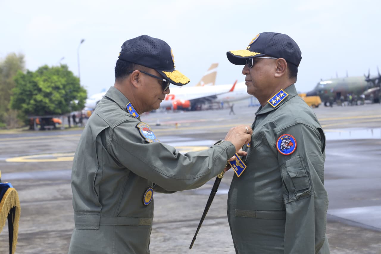 Setelah mendarat di Apron Baseops Pangkalan Udara Angkatan Laut (Lanudal) Juanda, Rektor Unhan Rl menjalani tradisi penyematan Brevet Kehormatan Penerbangan TNI Angkatan Laut oleh Danpuspenerbal.