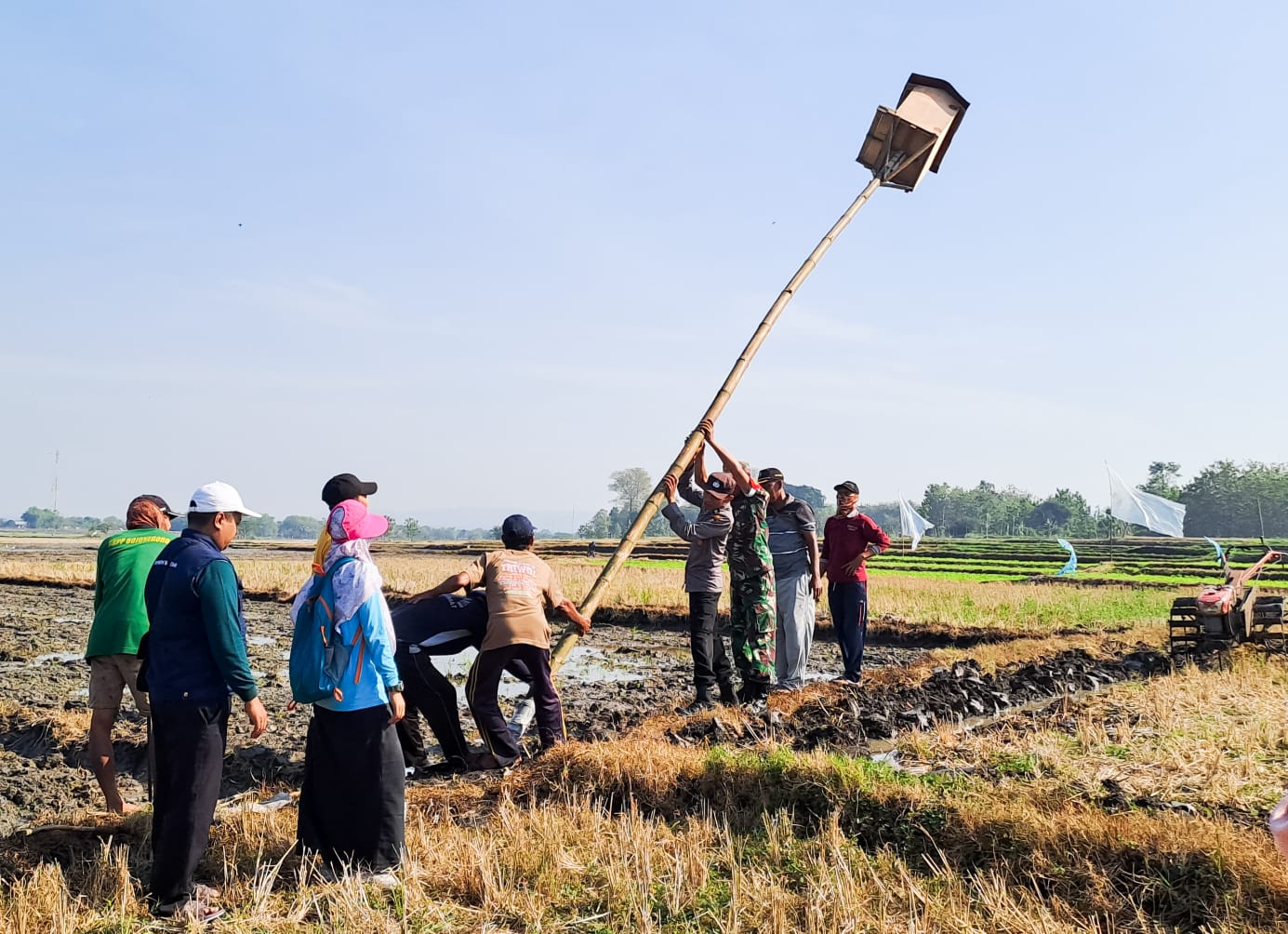 PI – BOJONEGORO, Bintara Pembina Desa atau Babinsa Koramil 17/Kalitidu Kodim 0813 Bojonegoro Jawa Timur, Serka Moh. Ibni Alwi, bersinergi dengan petugas Dinas Pertanian Kabupaten Bojonegoro dan Pemerintah Desa mendampingi para petani Dusun Srumap RT.009/RW.002 Desa Sumengko Kecamatan Kalitidu Kabupaten Bojonegoro pada kegiatan Gerakan Massal (Germas) pemasangan Rumah Burung Hantu (Rubuha).