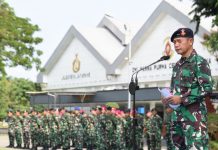 PI – Surabaya, Komandan Pangkalan Utama TNI Angkatan Laut (Danlantamal) V Laksamana Pertama TNI Supardi yang diwakili Kadisminpers Lantamal V Letkol Laut (S) Dr. Arie Herumurti menggelar Upacara Penaikan Bendera 17-an dengan menyampaikan sambutan dari Panglima TNI Laksamana TNI Yudo Margono, bertempat di Lapangan Apel Mako Lantamal V Perak, Surabaya. Senin (17/04/2023).