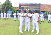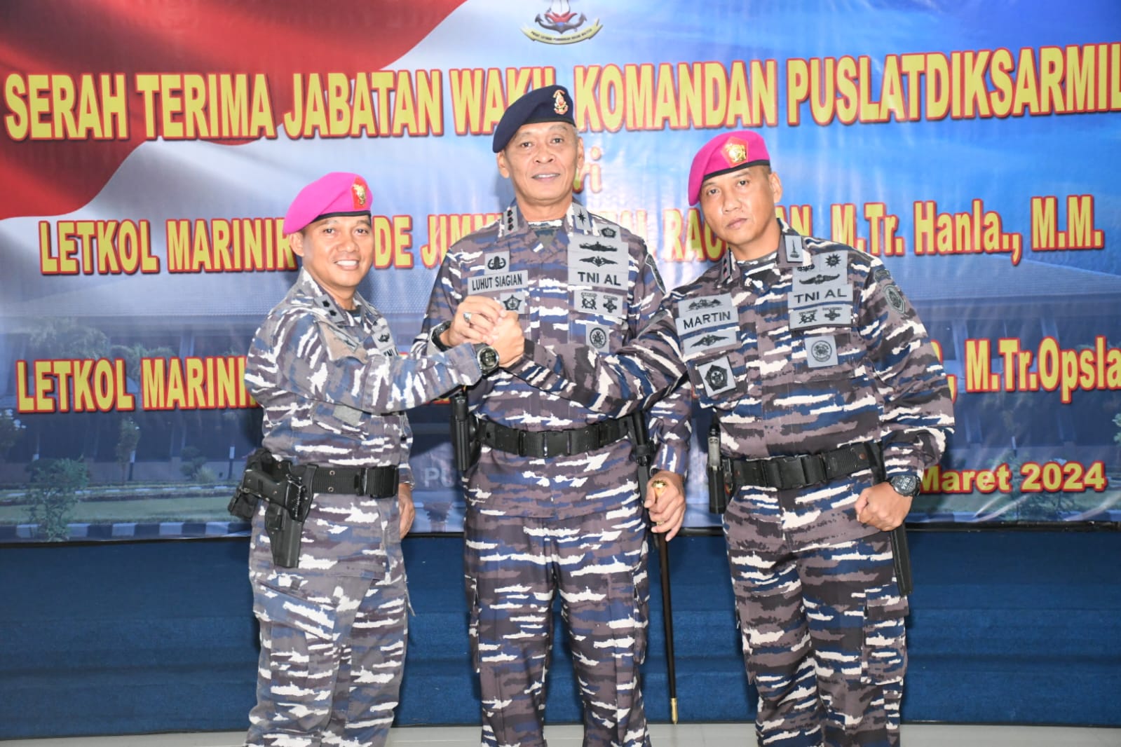 PI – Surabaya, 02 Maret 2024, Komandan Puslatdiksarmil (Danpuslatdiksarmil) Kodiklatal Kolonel Laut (P) Irwan S.P. Siagian memimpin Serah Terima Jabatan (Sertijab) Wakil Komandan Puslatdiksarmil Kodiklatal dari Letkol Marinir La Ode Jimmy Herizal Rachman kepada Letkol Marinir Martin Mangasi Suwono Manurung, bertempat di Gedung Bawean Puslatdiksarmil Sidoarjo. Sabtu (02/03/2024).