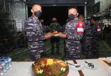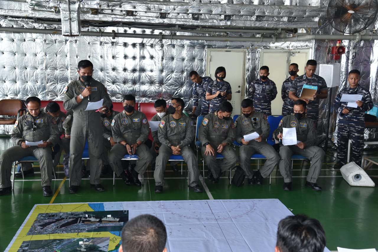 TNI AL. Koarmada II. Surabaya, 04 Januari 2021, Jelang sehari pelaksanaan, Satgas Bhinneka Eka Bakti atau BEB yang dikomandani oleh Kolonel Laut (P) Sumarji Bimoaji menggelar Tactical Floor Game atau TFG di Geladak Heli KRI Surabaya-591, pada Selasa (04/01).