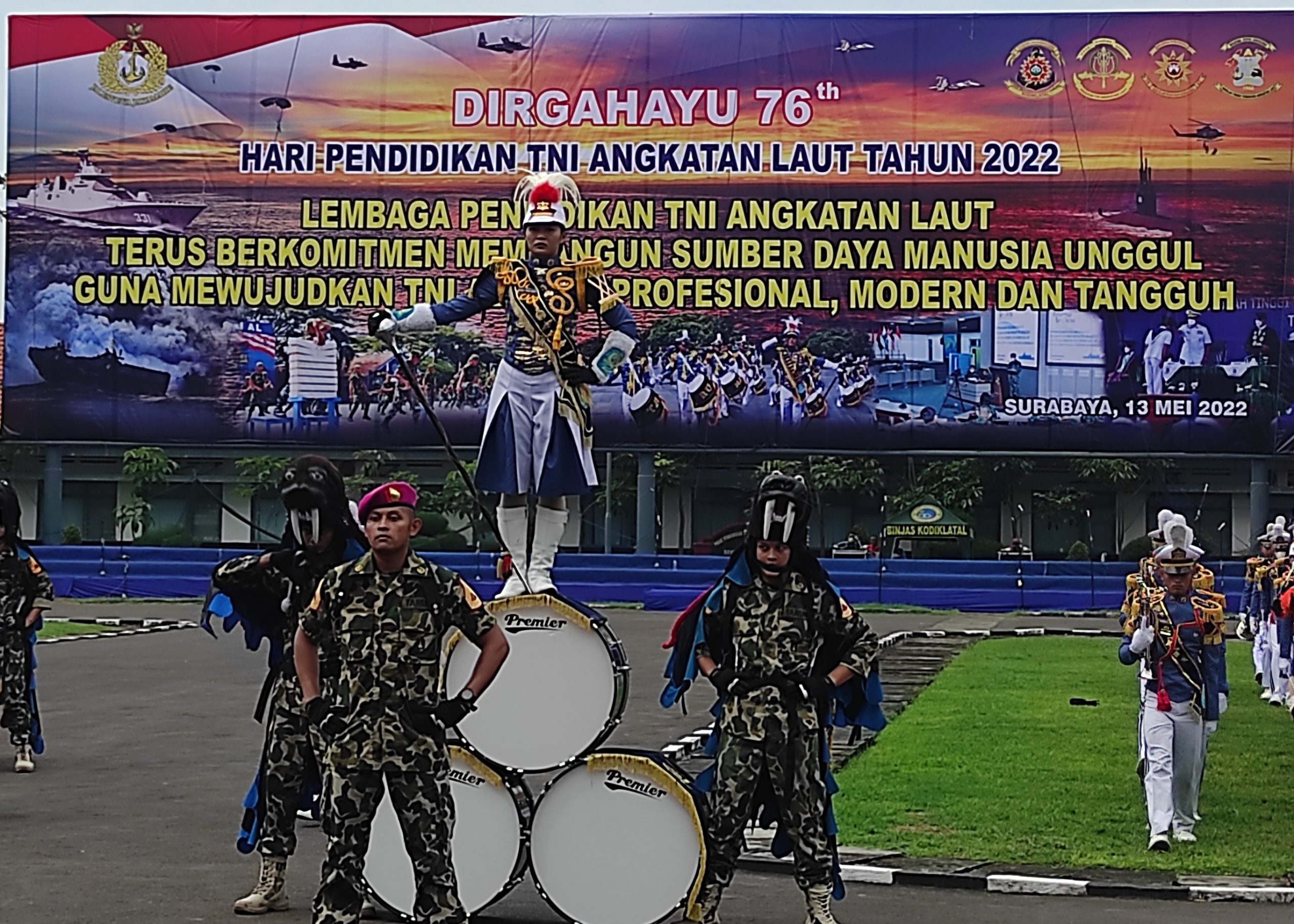 Paradigmaindonesia – Surabaya, 13 Mei 2022 Dalam rangka melestarikan budaya jawa, TNI Angkatan Laut menggelar kesenian Reog Ponorogo yang dimainkan oleh ratusan prajurit siswa Komando Pembinaan Doktrin, Pendidikan dan Latihan TNI AL (Kodiklatal) pada peringatan Hari Pendidikan TNI Angkatan Laut atau Hardikal ke-76 Tahun 2022 di Lapangan Laut Maluku Kodiklatal Bumimoro Surabaya, Jumat (13/5/2022).