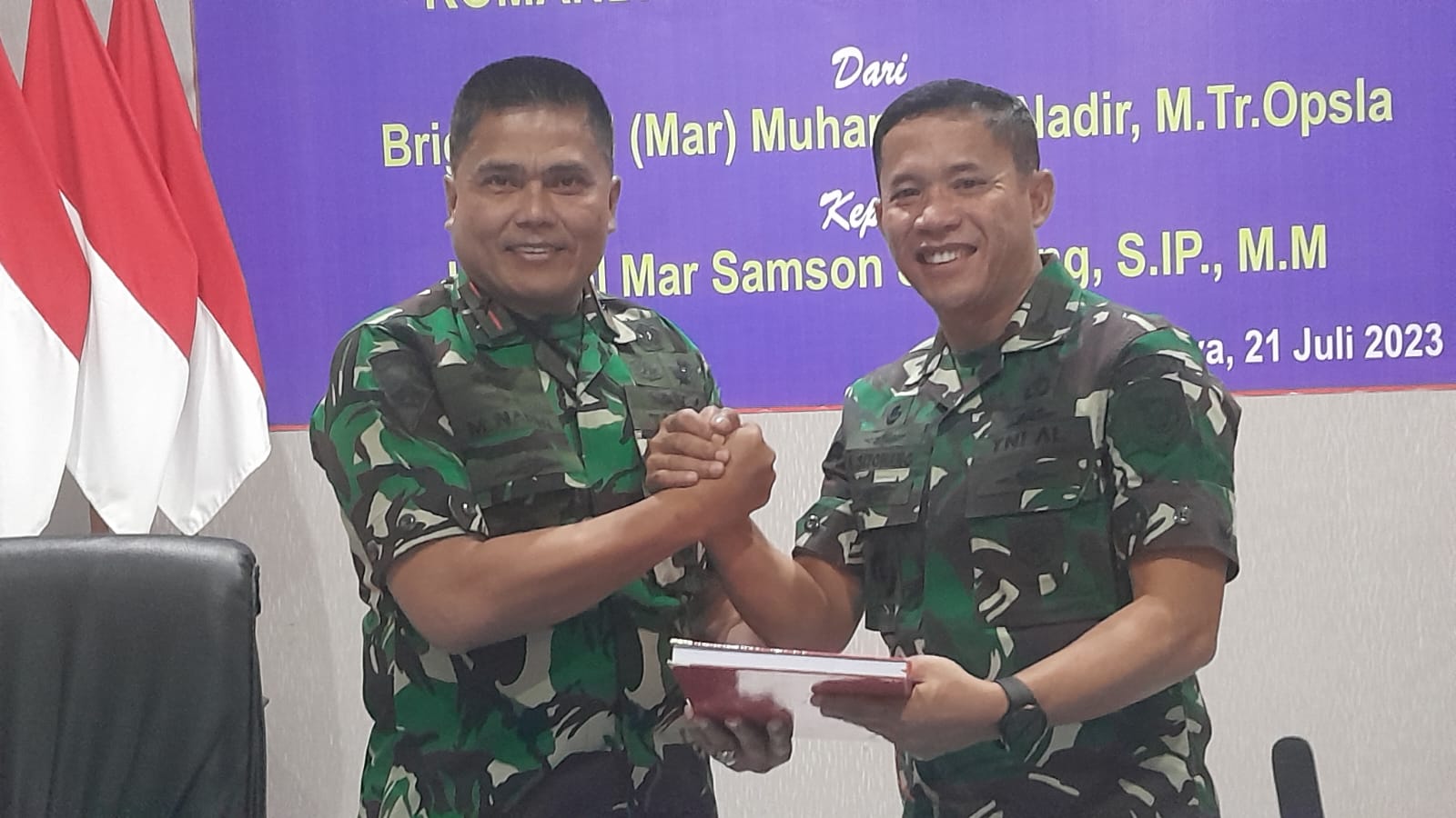 PI – Surabaya, (23/07/2023).Dalam rangka Pelaksanaan Serah terima jabatan (Sertijab) Komandan Komando Pendidikan Marinir (Dankodikmar) Komando Pembinaan Doktrin Pendidikan Dan Latihan TNI Angkatan Laut (Kodiklatal) Brigjen TNI (Mar) Muhammad Nadir, M.Tr.Opsla., bersama d calon penggantinya Kolonel Marinir Samson Sitohang, S.IP., M.M., Melaksanakan memoràndum dàn tour Facility di lingkungan Kodikmar, Gunungsari Surabaya. Jumat, (21/07/2023)