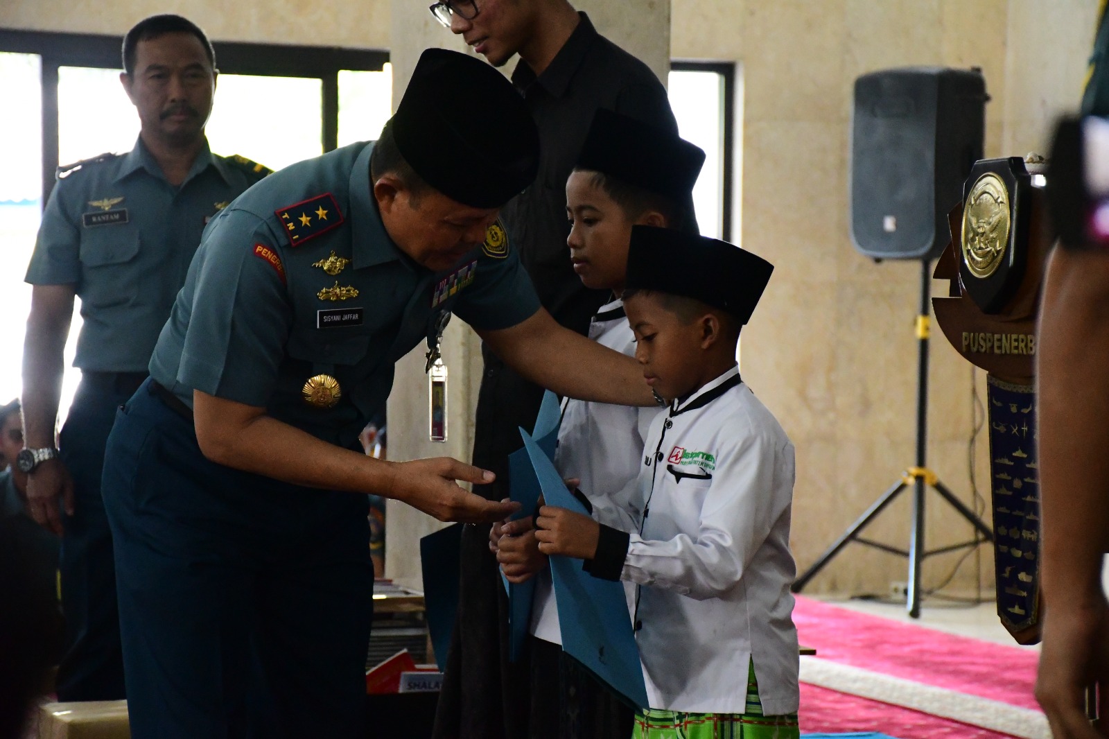 Pada momen ini, Komandan Puspenerbal juga memberikan santunan kepada tujuh anak yatim piatu dari Yayasa Panti Asuhan Istiqomah, Pulungan, Sidoarjo.