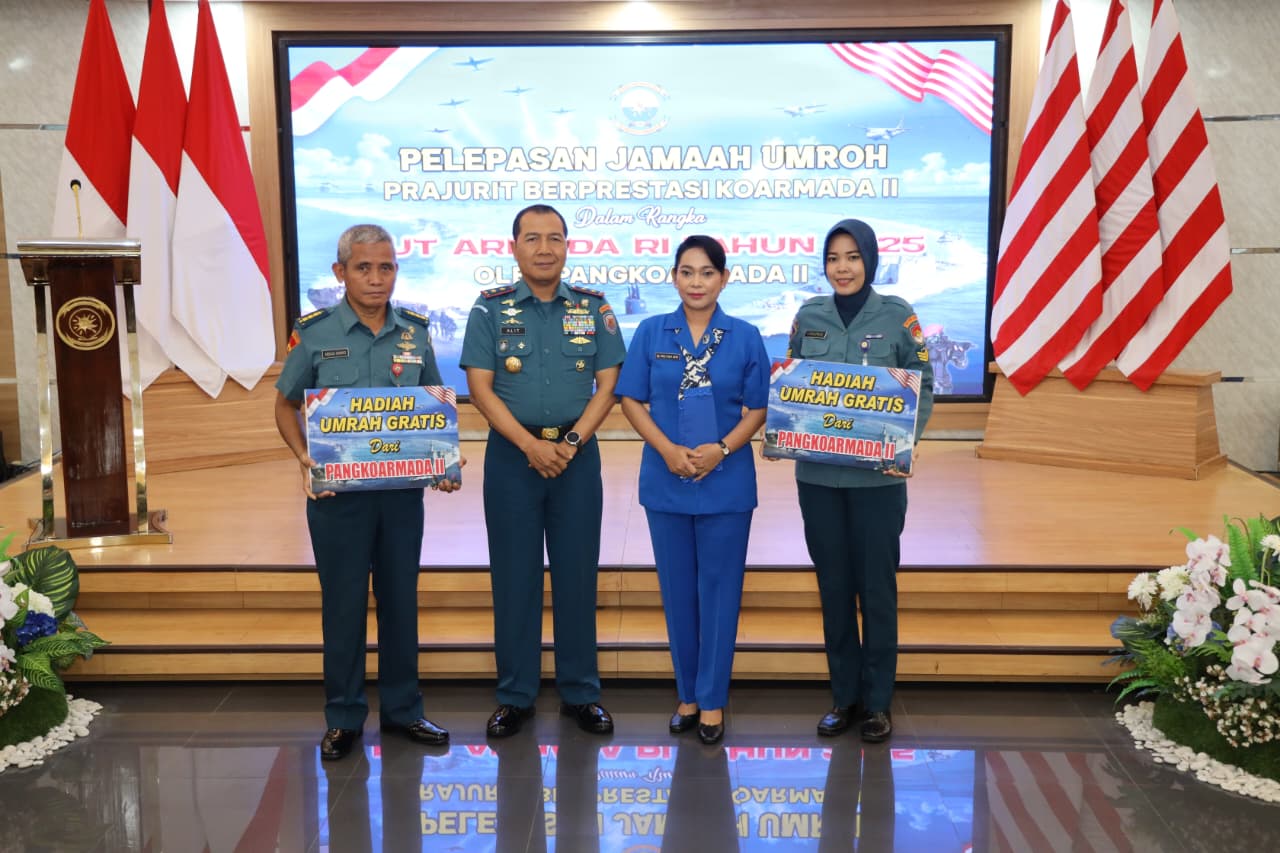 PI – Surabaya, 20 November 2025. Panglima Komando Armada II (Pangkoarmada II) Laksda TNI I G. P. Alit Jaya, S.H., M.Si., didampingi Ketua Gabungan II Jalasenastri Koarmada RI Ny. Yully Alit Jaya, secara resmi melepas keberangkatan prajurit Koarmada II yang mendapat kesempatan melaksanakan ibadah Umroh sebagai bentuk apresiasi atas prestasi mereka dalam ajang Porwiltim 2025. Acara pelepasan berlangsung khidmat di Lounge Majapahit Koarmada II, Ujung Surabaya, Kamis (20/11), sekaligus menjadi salah satu rangkaian peringatan Hari Armada RI Tahun 2025.