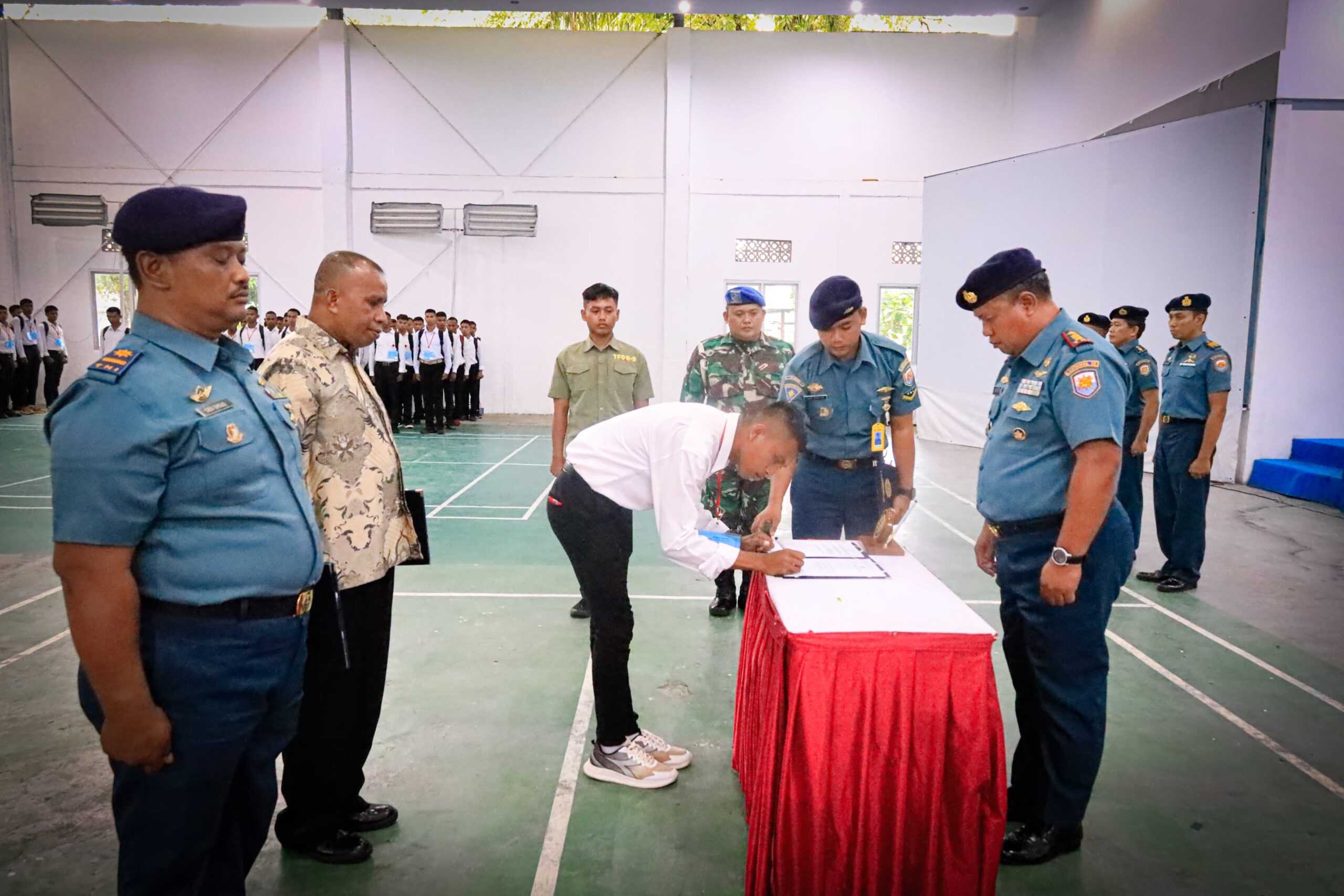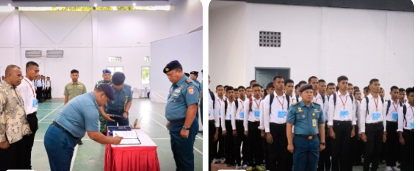 PI – Ambon. Brigadir Jenderal TNI (Mar) Suwandi, S.A.P., M.M., diwakili Wakil Komandan (Wadan) Lantamal IX Kolonel Laut (P) Batos Leksono Menandatangani Pakta Integritas Calon Tamtama (CATA) Prajurit Karir (PK) Gelombang I Tahun Anggaran 2025 bertempat di Gedung DR J Leimena Lantamal IX, Kompleks Lantamal IX Ambon, Desa Halong, Kec. Baguala, Kota Ambon, Maluku. Selasa (04/02/2025)