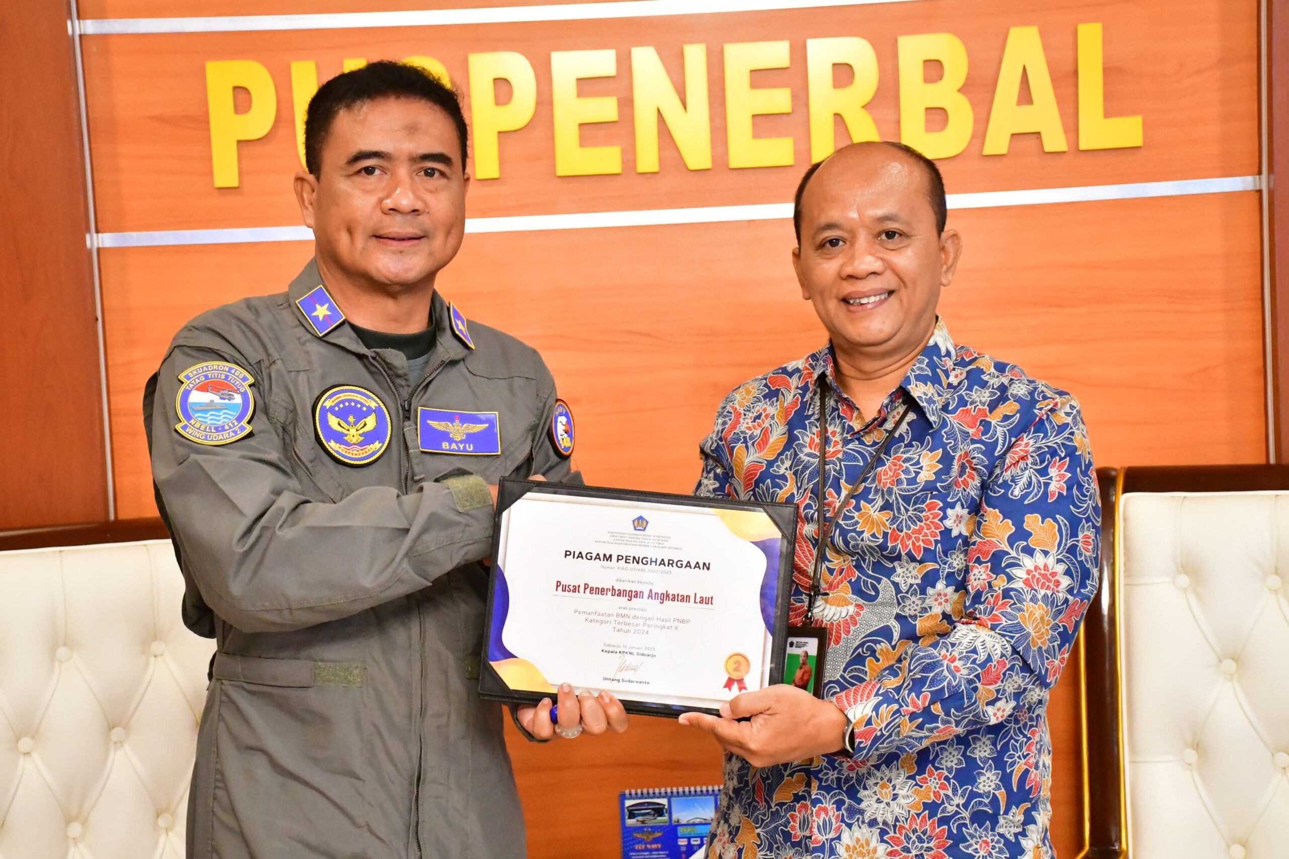 PI – Sidoarjo, Pusat Penerbangan TNl Angkatan Laut (Puspenerbal) menerima Sertifikat Penghargaan dari Kantor Pelayanan Kekayaan Negara dan Lelang (KPKNL) atas Prestasi Pemanfaat Barang Milik Negara (BMN) Hasil Penerimaan Negara Bukan Pajak (PNBP) Kategori Terbesar Petingkat II Tahun 2024.
