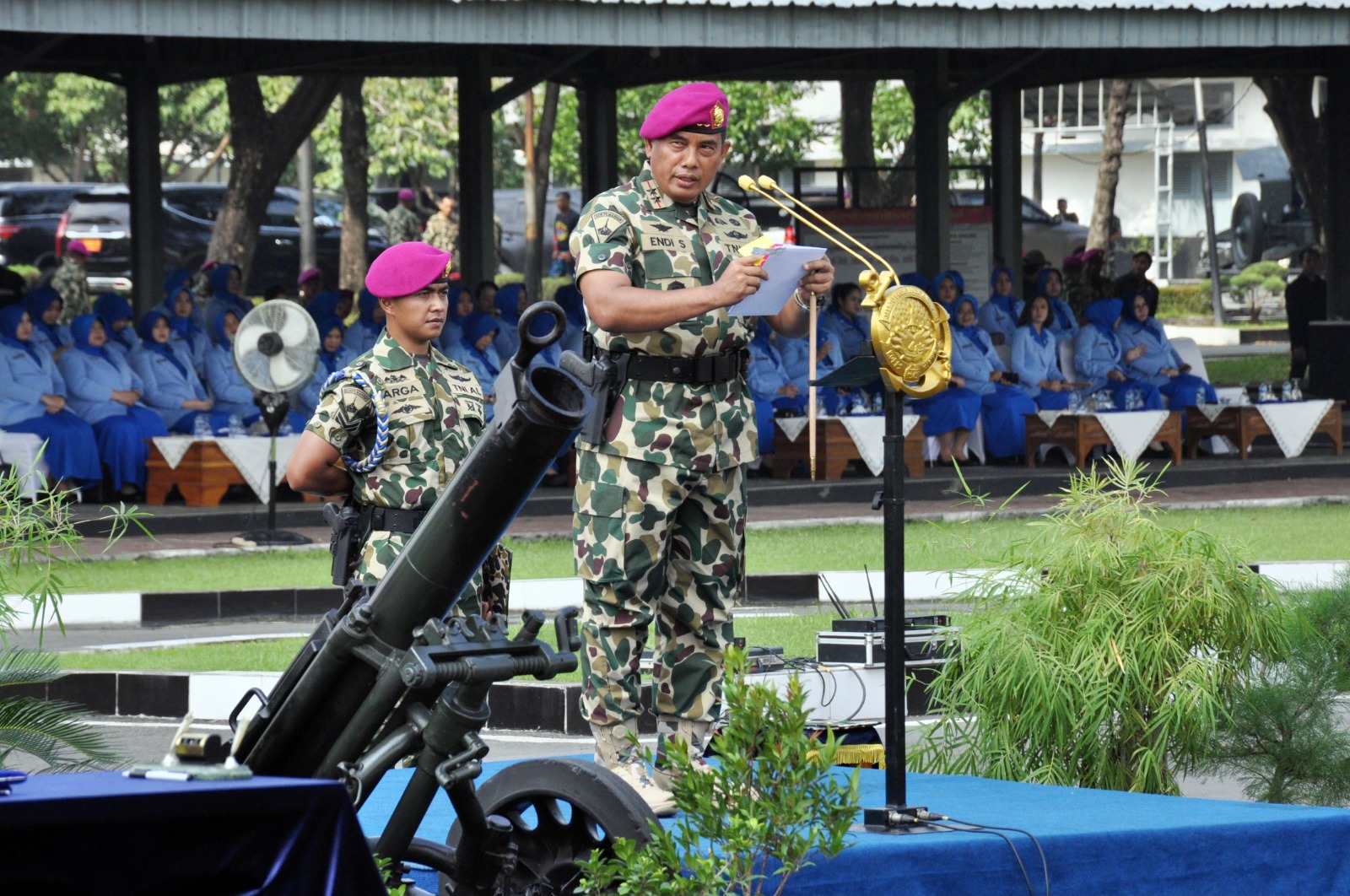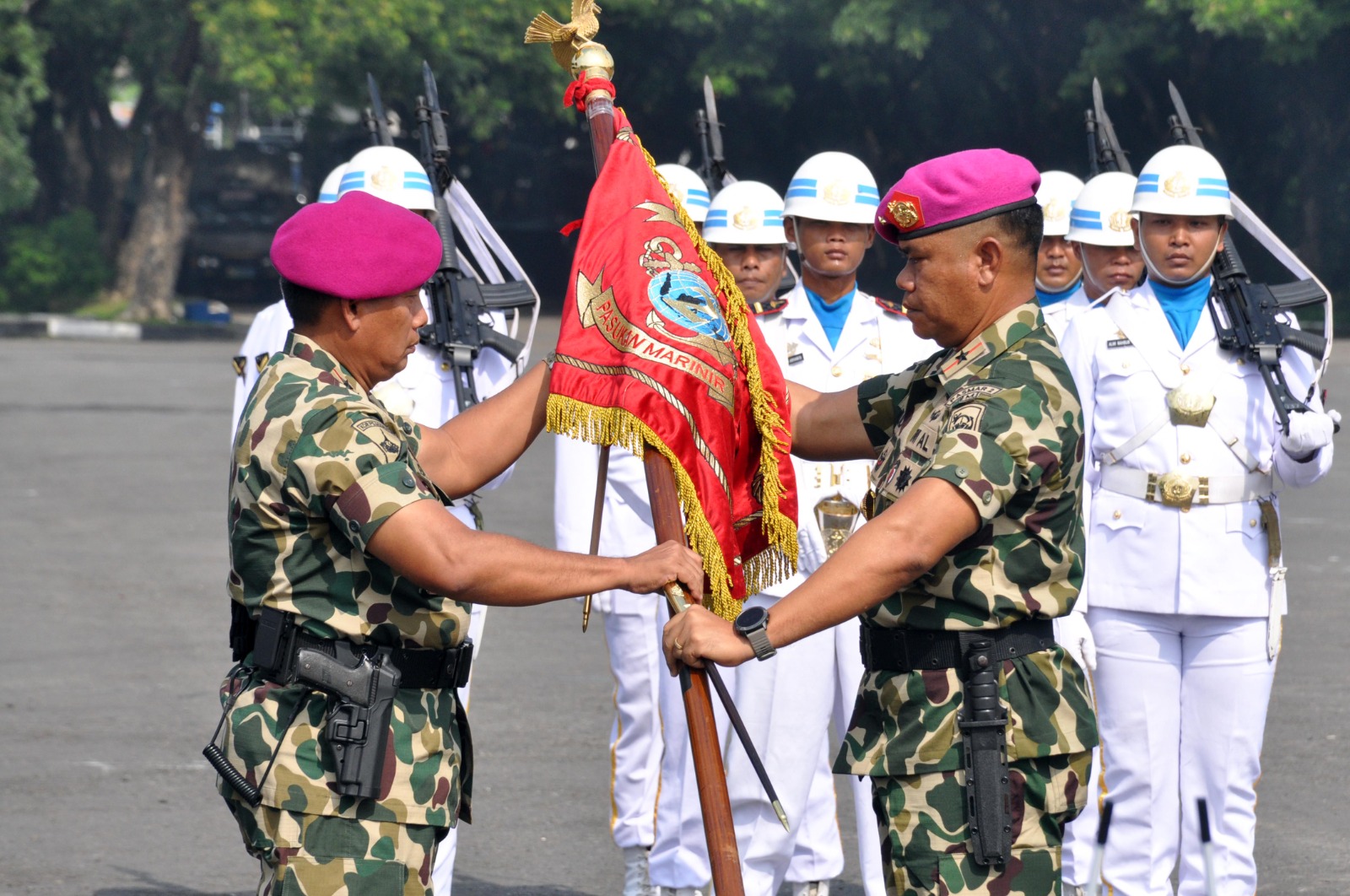 PI – Surabaya, 19 Februari 2024, Dalam rangka pergantian pejabat di lingkungan Marinir TNI Angkatan Laut, Ir Kodiklatal Brigjen TNI Marinir Ahmad Fajar mewakili Dankodiklatal Letjen TNI Marinir Nur Alamsyah menghadiri Upacara Serah Terima Jabatan (Sertijab) Komandan Pasmar-2 yang dipimpin langsung oleh Dankormar Mayjen TNI Marinir Endi Supardi, bertempat di Lapangan Apel Kesatrian Marinir Soetedi Senaputra, Karang Pilang Surabaya. Senin, (19/02/2024).