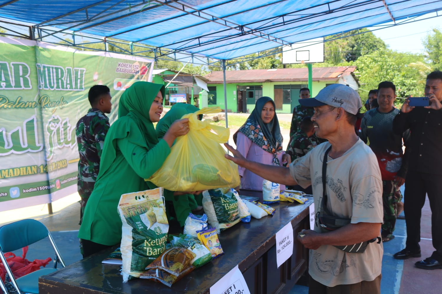 Di Bazar Murah terlihat Masyarakat Halsel berbondong-bondong dan sangat antusias menyambut Bazar Murah yang digelar Kodim 1509/Labuha, untuk mendapatkan Beberapa Paket Sembako, Paket Sembako kodim 1509/Labuha menbagi beberapa Jenis Paket dengan Berbagi Harga, dimulai dengan Paket 1 Rp.122.000, Paket 2 Rp. 124.000, dan Paket 3 Rp. 52.000, serta menyediakan Sembako dalam bentuk Eceran,