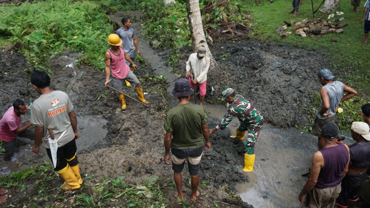 PI – Labuha, Desa Bumi Rahmat Kecamatan Gane Barat, di Beberapa Dusunnya Sulit mendapatkan Air Bersih untuk memenuhi kebutuhan dasar masyarakat, apalagi saat musim kemarau akan lebih menyulitkan masyarakat desa untuk mendapatkan air bersih, Satgas TMMD Ke 121 Kodim 1509/Labuha bergerak untuk membangun Bak Penampungan dan akan memasang Pipa yang akan disalurkan ke rumah rumah warga, Sabtu (27/07/2024),