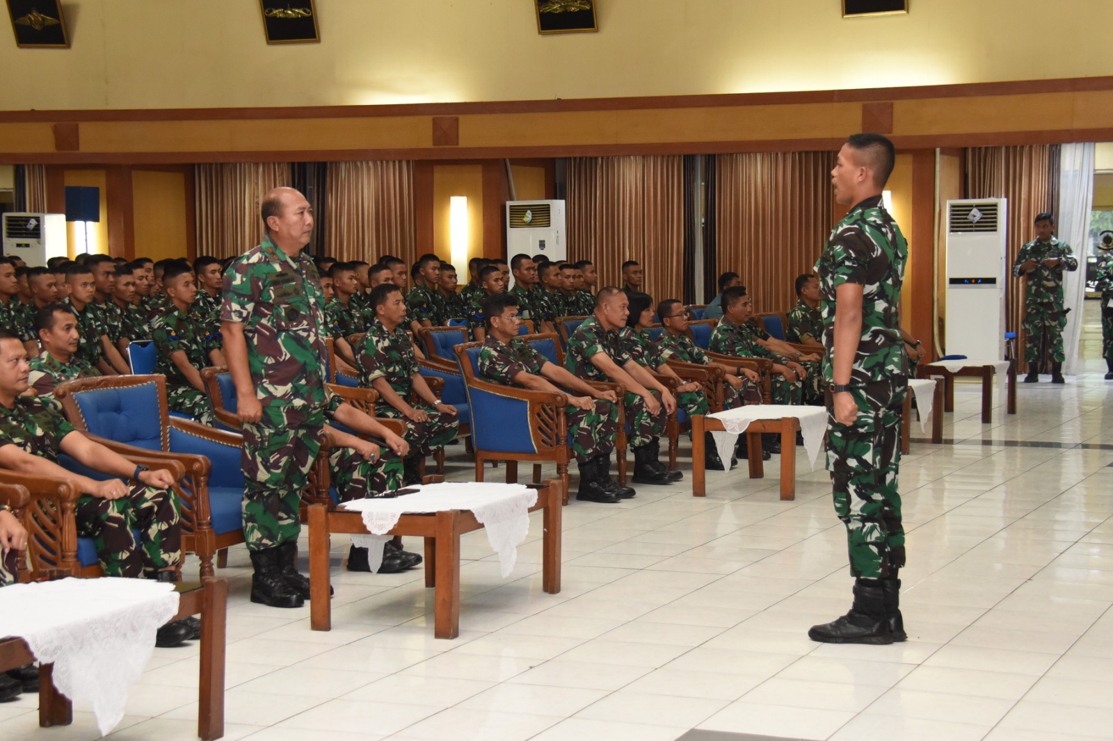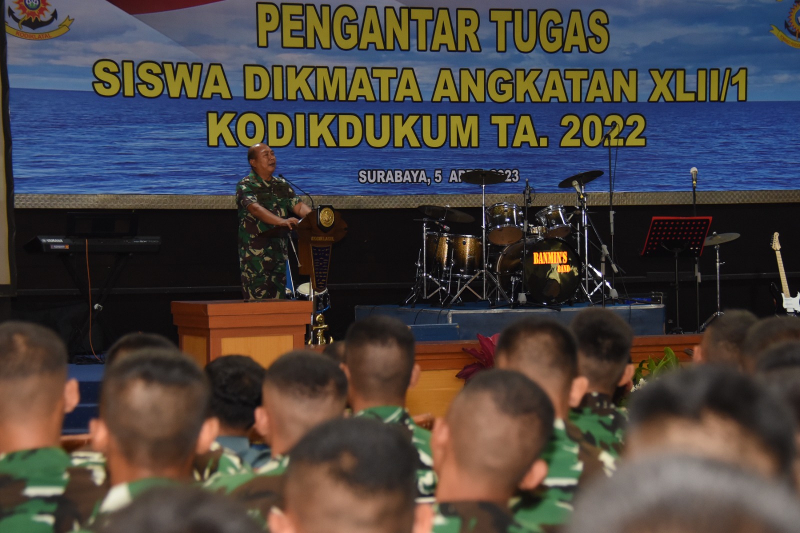 PI – Surabaya, 6 April 2023, Menjelang pelaksanaan penutupan pendidikan dasar golongan (sargolan) yang dilaksanakan 6 April 2023, Komandan Komando Pendidikan Dukungan Umum (Dankodikdukum) Kodiklatal Laksma TNI Budi Raharjo memberikan pembekalan kepada 357 orang siswa Pendidikan Pertama Tamtama (Dikmata) Angkatan XLII Gelombang 1 TA 2022 yang siap mengabdi untuk TNI AL, bertempat di Gedung R. Moeljadi Kodiklatal, Bumimoro Surabaya, Rabu, (05/04/2023) kemarin.
