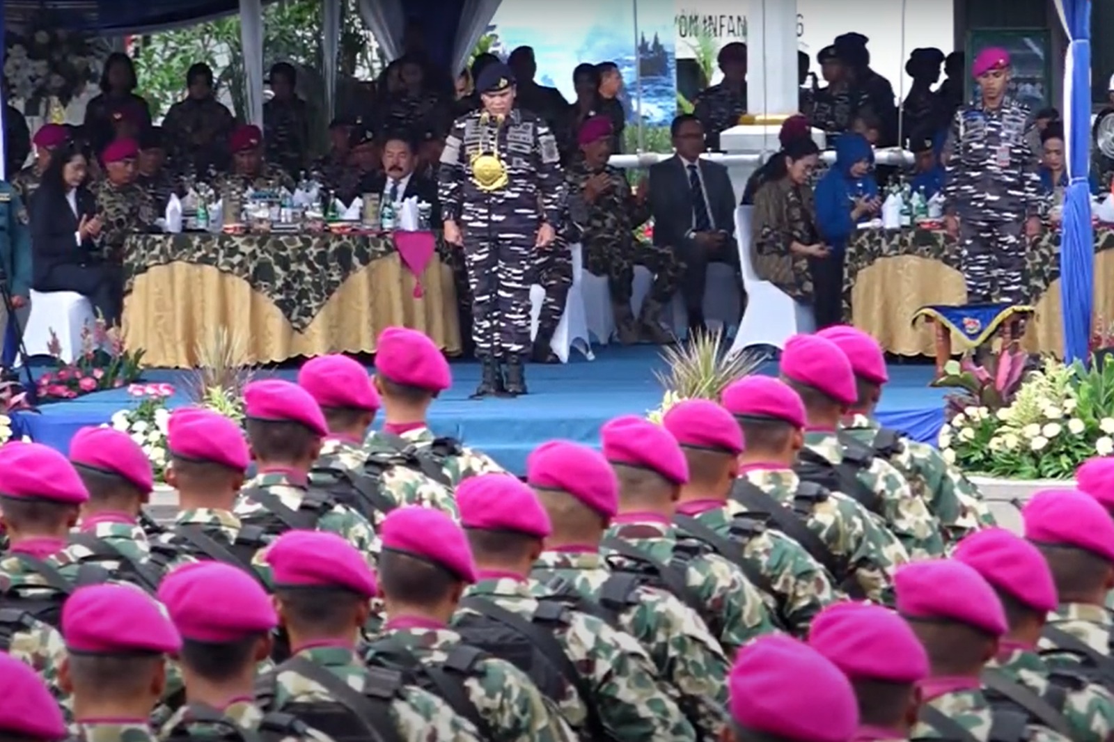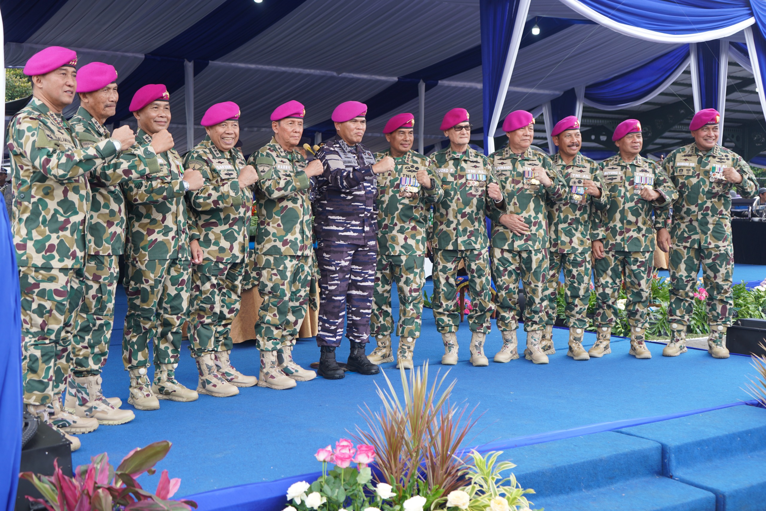 PI – Jakarta, 14 Agustus 2025 Komandan Komando Pembinaan Doktrin, Pendidikan dan Latihan TNI Angkatan Laut Letjen TNI (Mar) Nur Alamsyah didampingi Ketua Gabungan Jalasenastri Kodiklatal Ny. Ayu Nur Alamsyah menghadiri acara Syukuran Validasi Organisasi Korps Marinir dan 14 Komando Daerah Angkatan Laut (Kodaeral), yang berlangsung di Lapangan Apel Brigif 1 Marinir, Cilandak, Jakarta Selatan. Kamis (14/8).