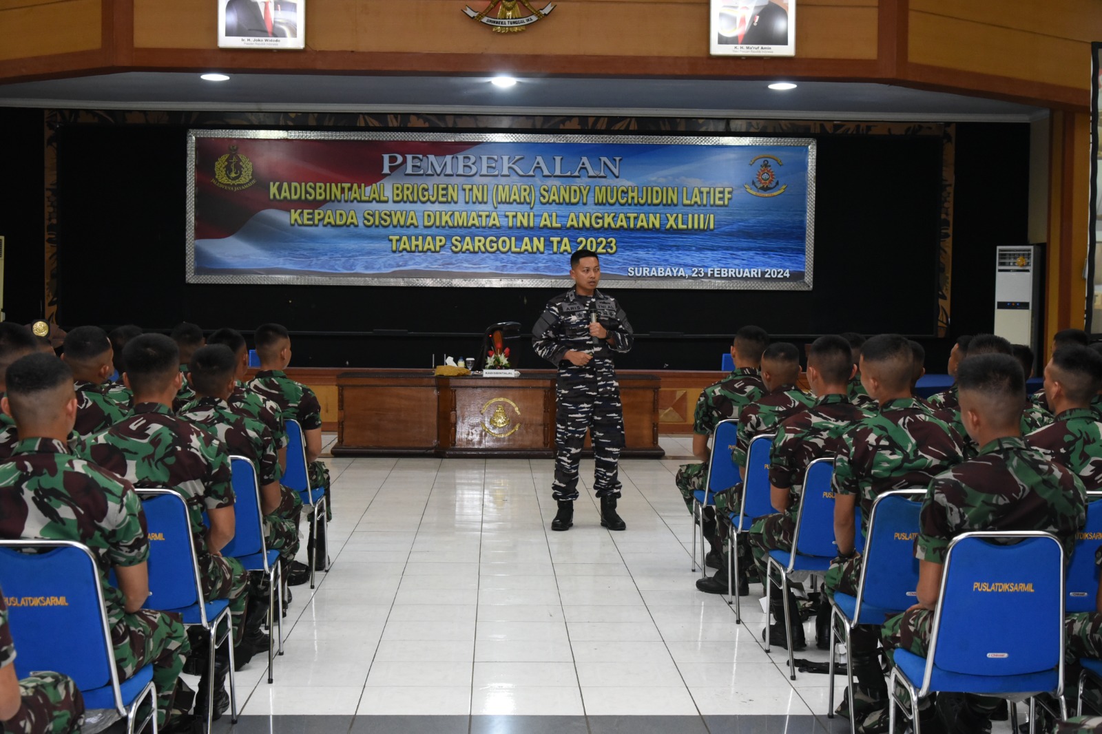 PI – Surabaya, 23 Februari 2024, Guna wujudkan Prajurit Tamtama Muda yang berkarakter sebagai ujung tombak satuan TNI Angkatan Laut (TNI AL), untuk itu Kepala Dinas Pembinaan Mental Angkatan Laut (Kadisbintalal) Brigjen TNI Marinir Sandy Muchjidin Latief memberikan Pembekalan tentang Empat Pilar dan Strategi Disbintalal kepada 408 Siswa Pendidikan Pertama Tamtama (Dikmata) Kodikopsla dan Kodikdukum, Angkatan 43/1 TA. 2023, bertempat di Gedung Moeljadi, Kodiklatal Bumi Moro Surabaya. Jumat (23/02/2024).