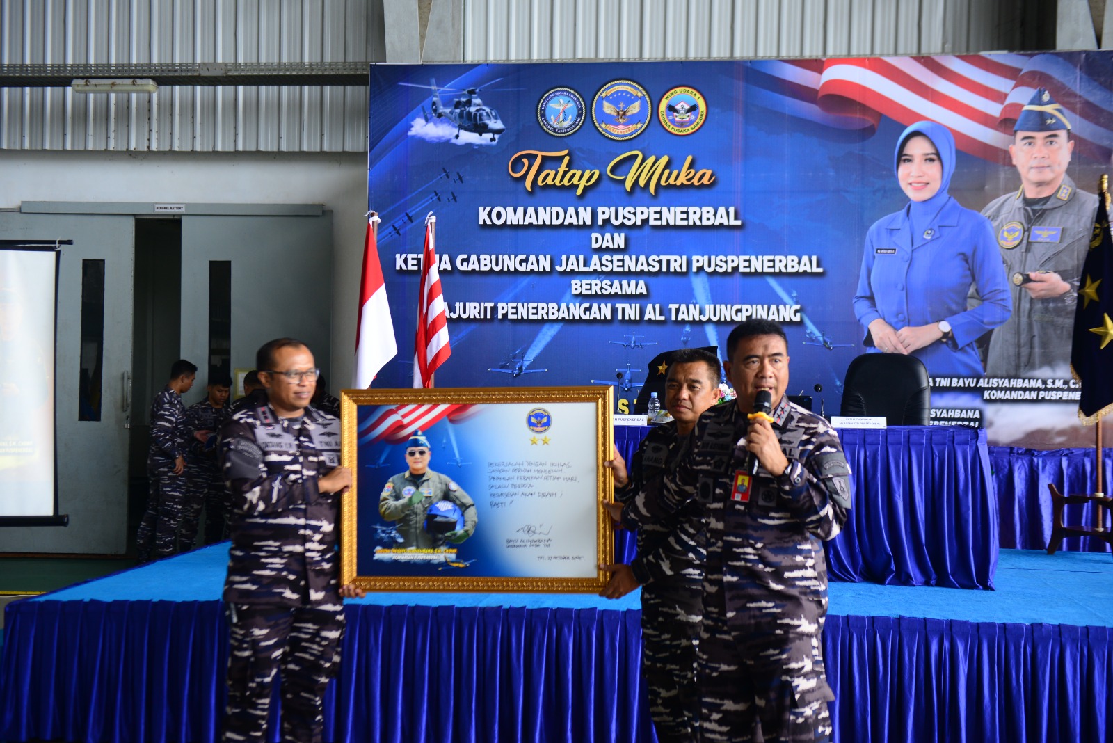 Komandan Pusat Penerbangan TNI Angkatan Laut Laksda TNI Bayu Alisyahbana bersama Ketua Gabungan Jalasenastri Puspenerbal, Ny. Dicca Bayu berkesempatan tatap muka dengan Prajurit Penerbangan TNI AL dan Jalasenastri wilayah Tanjungpinang di Hanggar Lanudal Tanjungpinang kemarin.