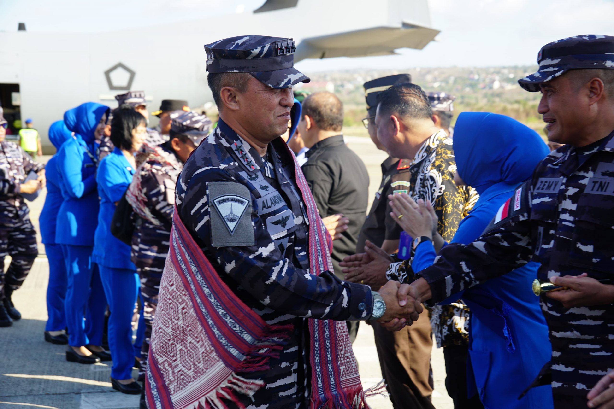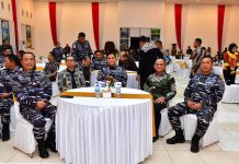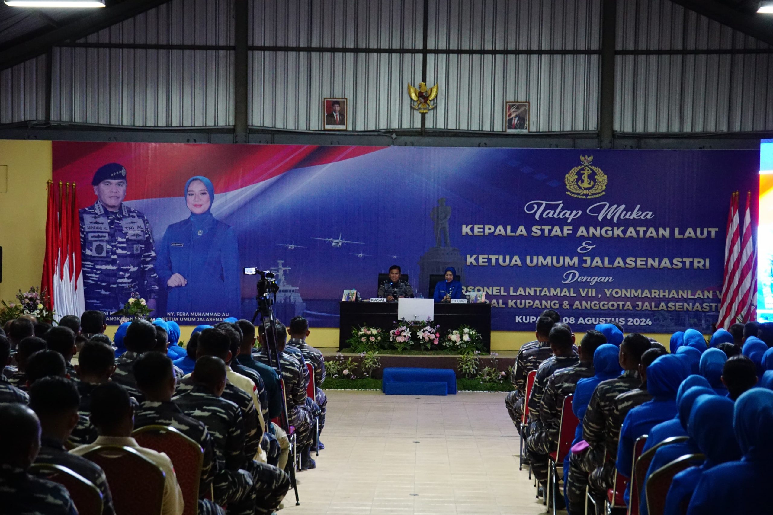 PI – kupang, 9 Agustus 2024, Komandan Kodiklatal didampingi Ketua Gabungan Jalasenastri Kodiklatal Ny. Ayu Nur Alamsyah menghadiri tatap muka dan pembekalan Kepala Staf Angkatan Laut (Kasal) Laksamana TNI Dr. Muhammad Ali kepada seluruh prajurit serta Pegawai Negeri Sipil (PNS) TNI AL yang berdinas di wilayah jajaran Lantamal VII Kupang, Lanudal Kupang, Yonmarhanlan VII Kupang dan anggota Jalasenastri Korcab VII juga cabang serta ranting di wilayah Kupang, bertempat di Marseling Area Mako Lantamal VII Kupang. Kamis (08/08).