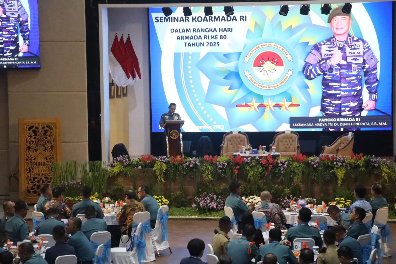 PI – Surabaya, Komandan Komando Daerah TNI AL Laksda TNI Ali Triswanto, S.E., M.Si., diwakili Wadan Kodaeral V Brigjen TNI (Mar) Suwandi, S.A.P., M.M., menghadiri Seminar dalam rangka memperingati Hari Armada Republik Indonesia Tahun 2025 yang mengusung tema “Penguat Sumber Daya Manusia Komando Armada Republik Indonesia Sebagai Pilar Pertahanan Maritim Dalam Bingkai Asta Cita Menuju Indonesia Emas 2045″, di Gedung Panti Tjahaya Armada (PTA) Koarmada II, Ujung, Surabaya. Rabu (10/12/2025)