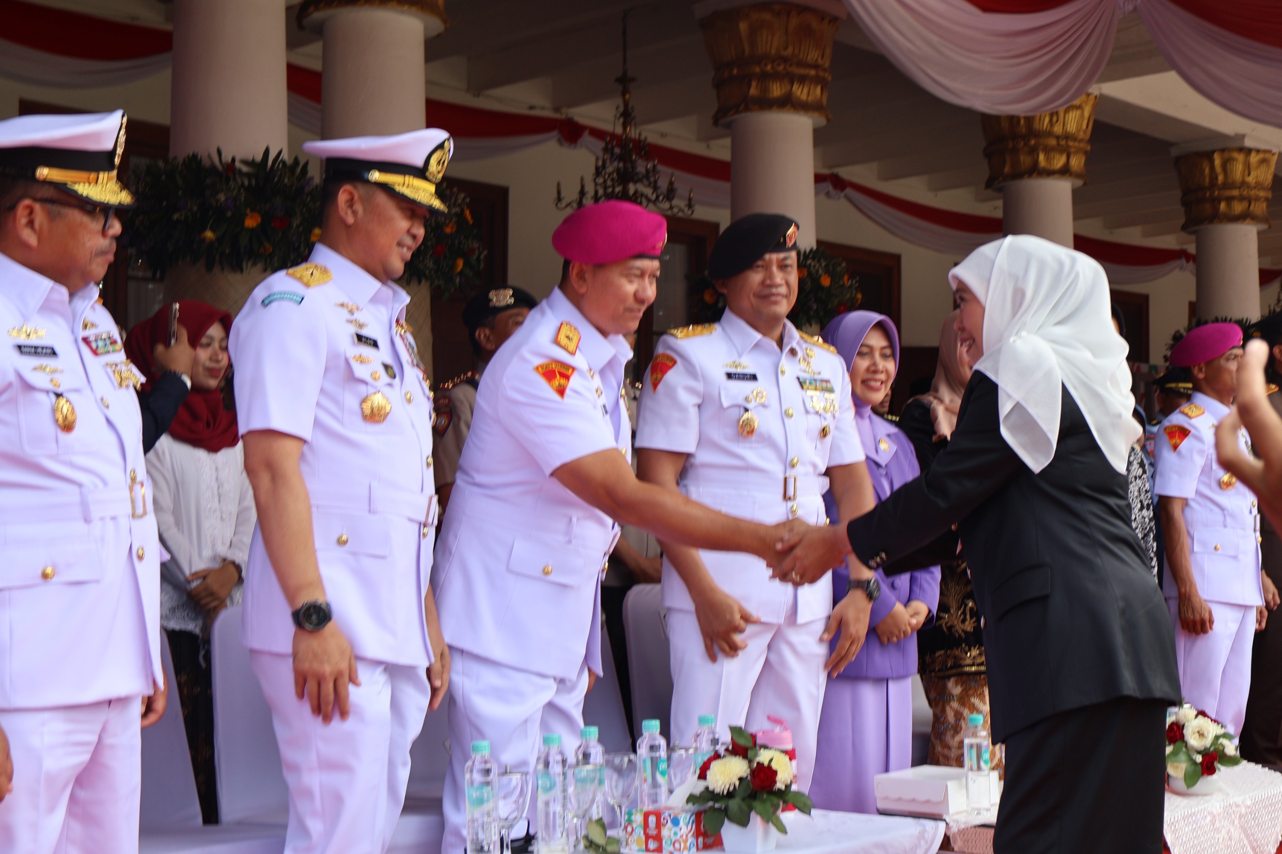 Gubernur Jawa Timur Khofifah Indar Parawansa memimpin jalannya upacara Hari Jadi ke-80 Provinsi Jawa Timur yang berlangsung khidmat dengan berbagai rangkaian acara yang dimulai dengan menyanyikan lagu Indonesia Raya hingga Mars Jawa Timur.