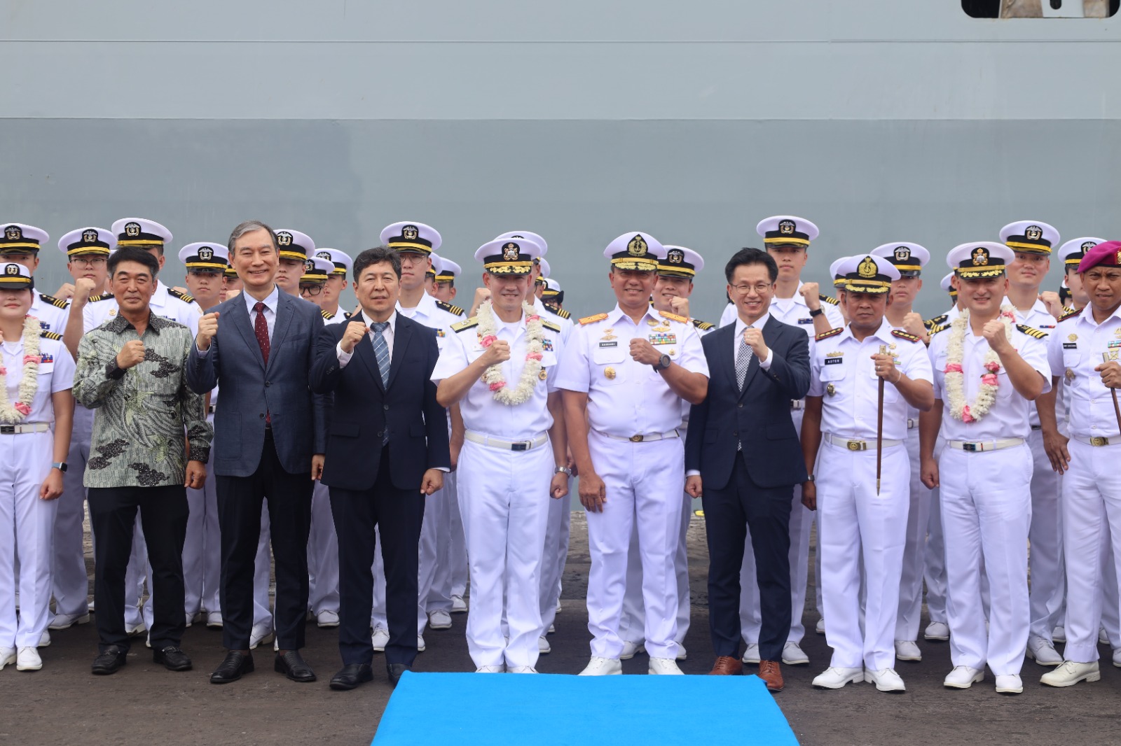PI – Surabaya, Komandan Komando Daerah TNI AL (Dankodaeral) V Laksda TNI Ali Triswanto, S.E., M.Si., diwakili Wadan Kodaeral V Brigjen TNI (Mar) Suwandi, S.A.P., M.M.., menyambut Kedatangan Kapal Perang Korea Selatan Roks Hansando (Ath 81) di Dermaga Jamrud Utara, Pelabuhan Tanjung Perak, Surabaya. Kamis (06/11/2025)