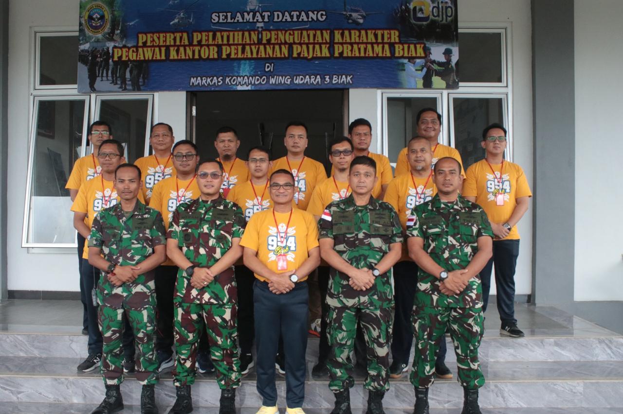 PI – Biak, Dalam rangka Pelatihan Penguatan Karakter bagi pegawai Pegawai Kantor Pelayanan Pajak Pratama (KPPP) Biak, Komandan Wing Udara 3 bersama Kepala KPPP Biak membuka pelatihan di kantor Mako Wing Udara 3 Pusenerbal, Biak, Kamis (14/11/2024).