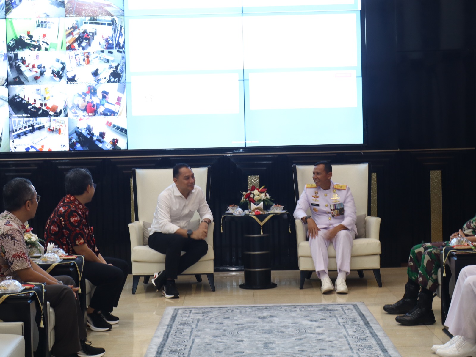 Dalam pertemuan tersebut, Wali Kota Surabaya Eri Cahyadi ST.MT menyampaikan, “selamat datang kepada Danlantamal V, harapan kami dalam pertemuan ini akan terjalin kerjasama yang baik Antara pemerintah kota dengan TNI Khususnya Lantamal V dalam membangun, menjaga dan kelancaran pelaksanaan tugas masing-masing. Langkah ini dilakukan secara bersama untuk menjaga kondusifitas Kota Pahlawan.” Ujar Walikota Surabaya.